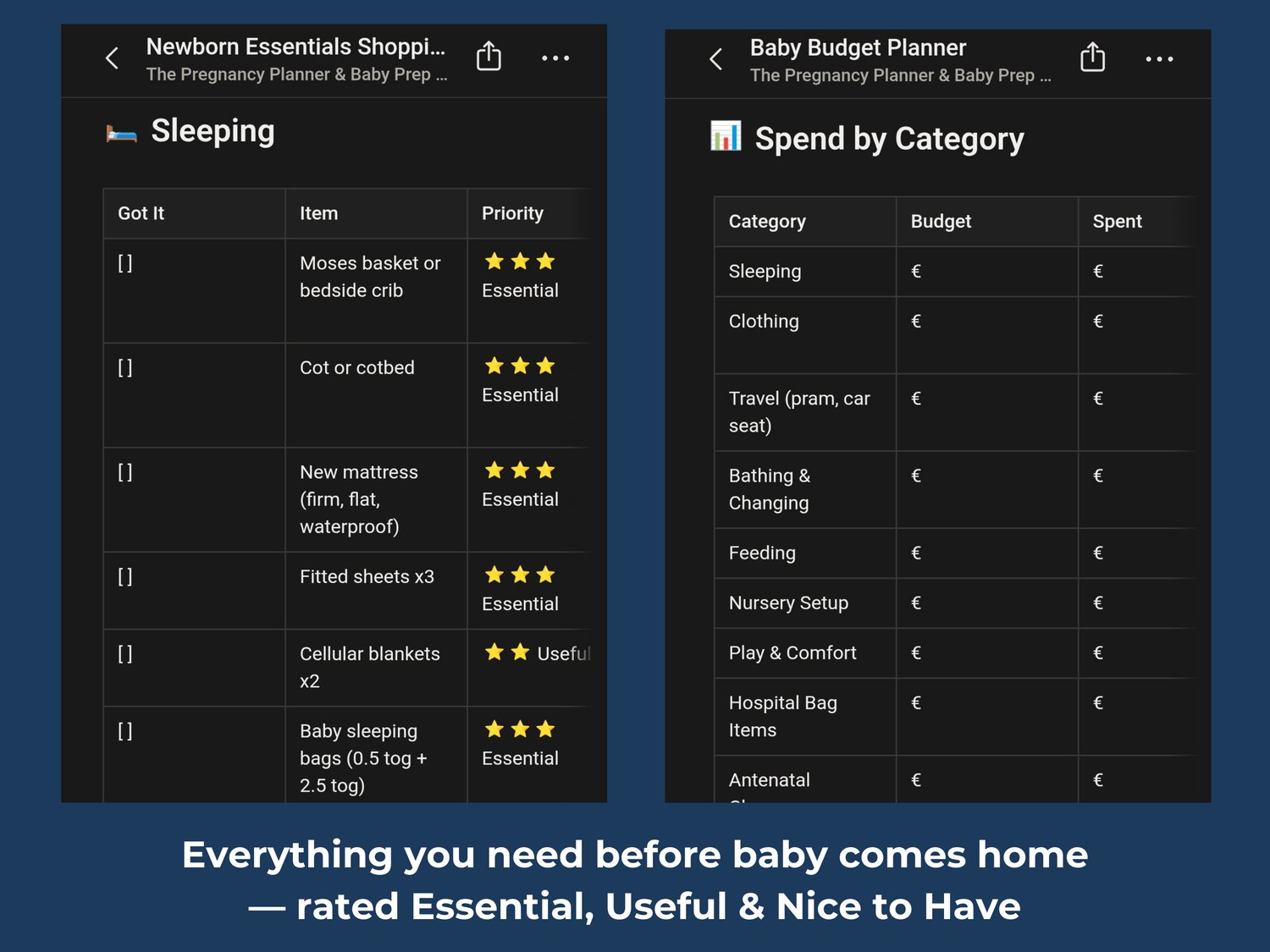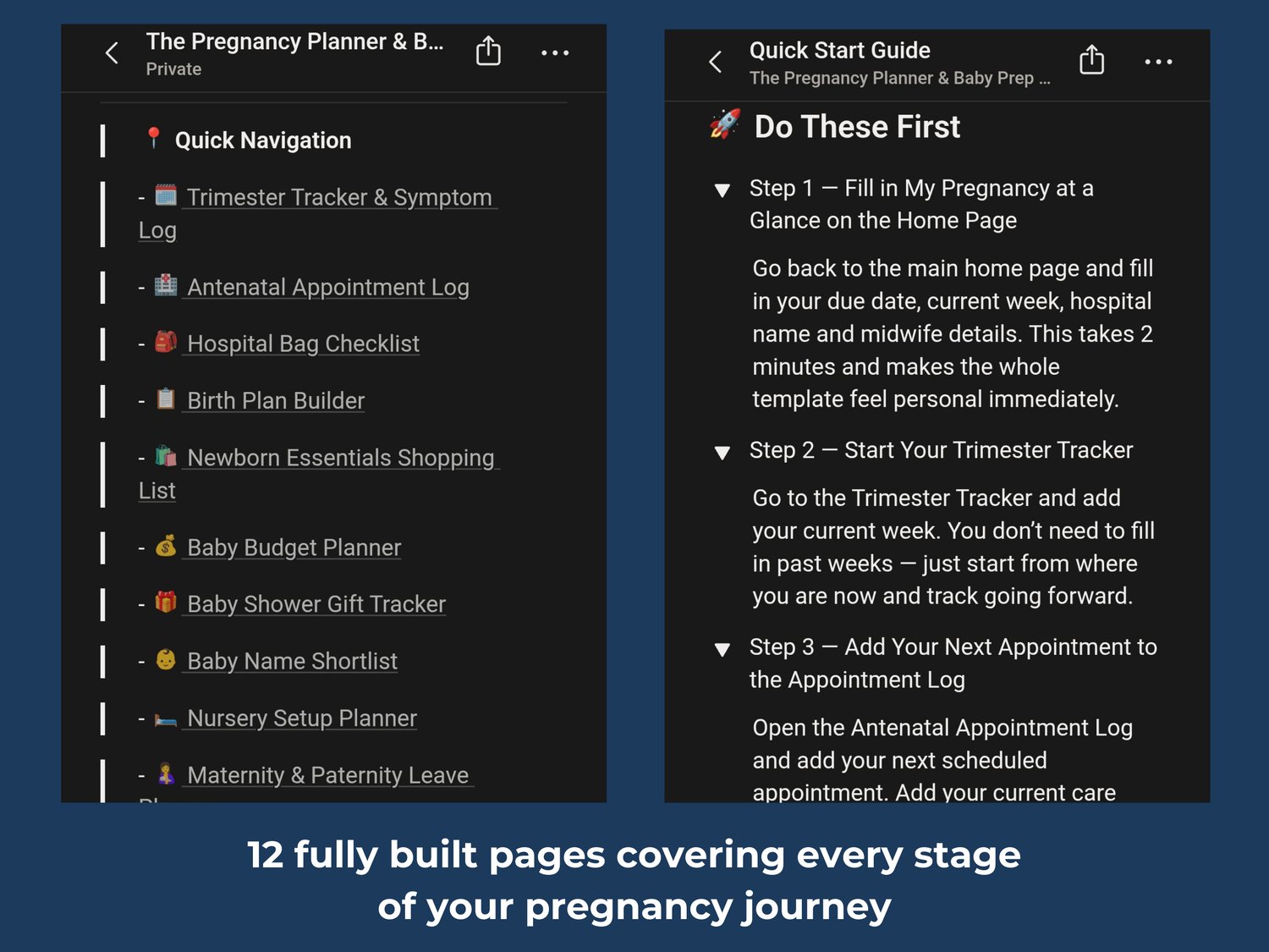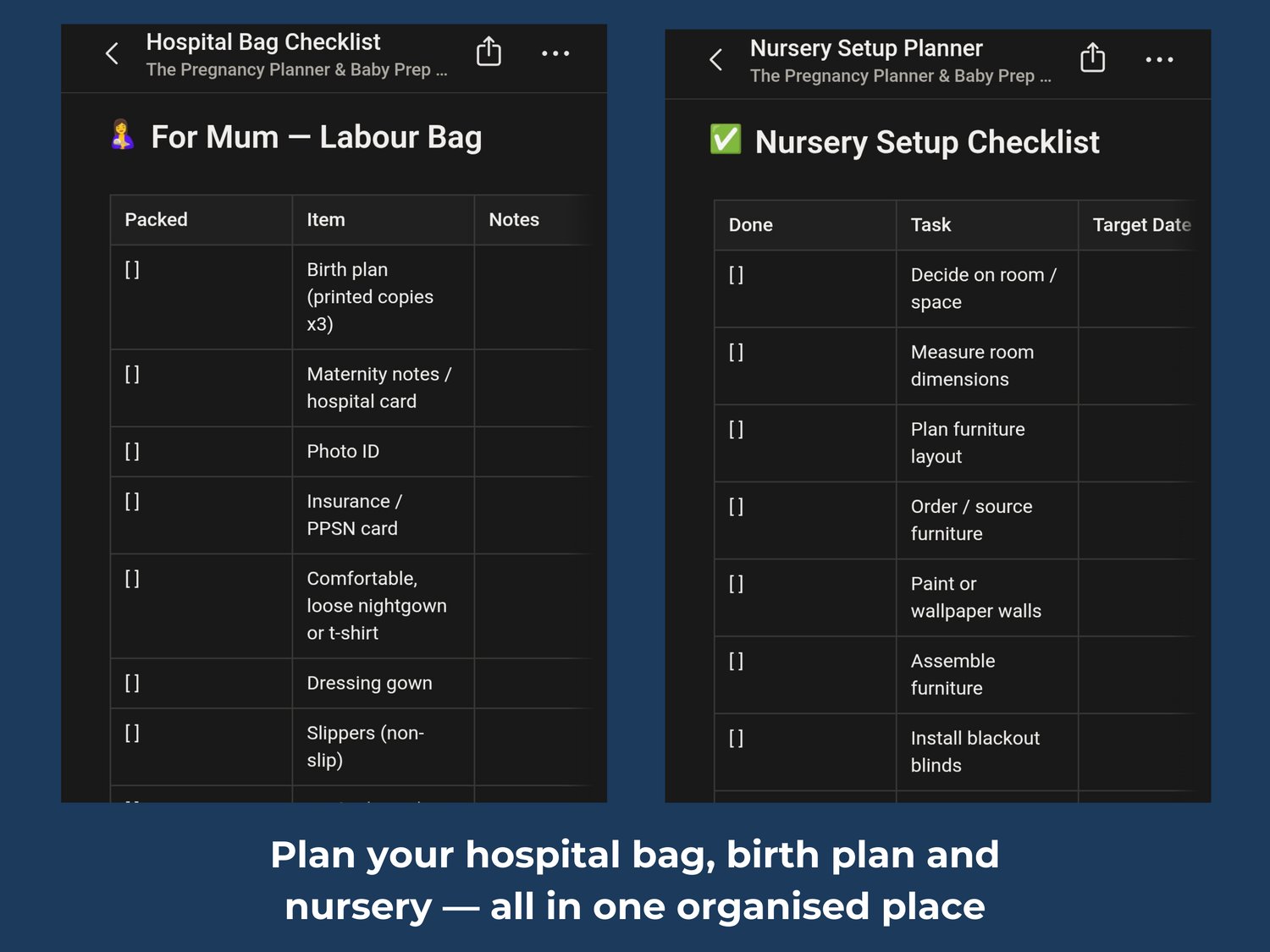 Planning for a baby means tracking appointments, building a hospital bag, writing a birth plan, budgeting for everything and managing maternity leave — all at the same time. This template gives you a calm, organised home for all of it.