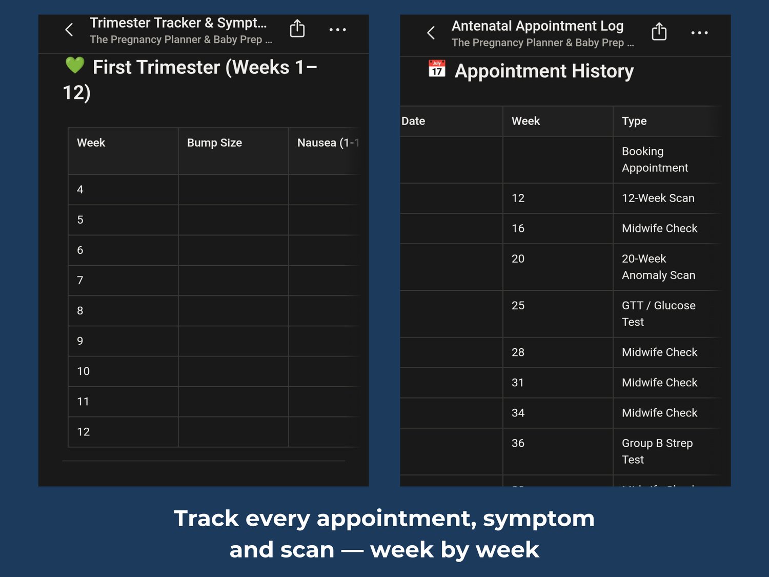 Week by week tracking tables for all 3 trimesters — nausea, fatigue, mood, baby movement and more. Common symptoms by trimester included as a reference guide.