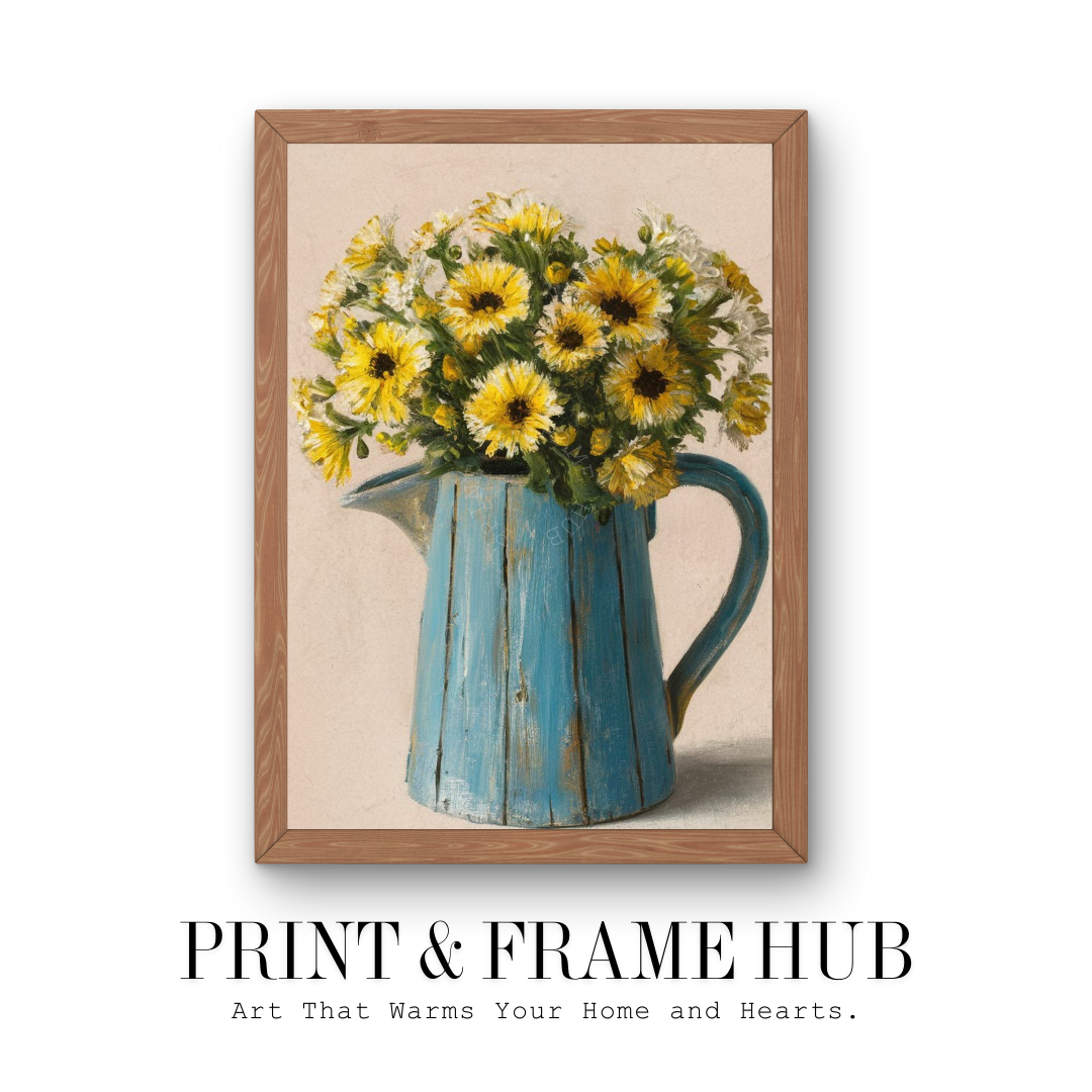 This painting features vibrant yellow flowers in a rustic blue jug. The artist's detailed and warm colors create a cozy, inviting scene. Perfect for adding country charm, it brings warmth and cheer to any room. Ideal for floral decor and rustic aesthetics, it's a standout piece for any wall.