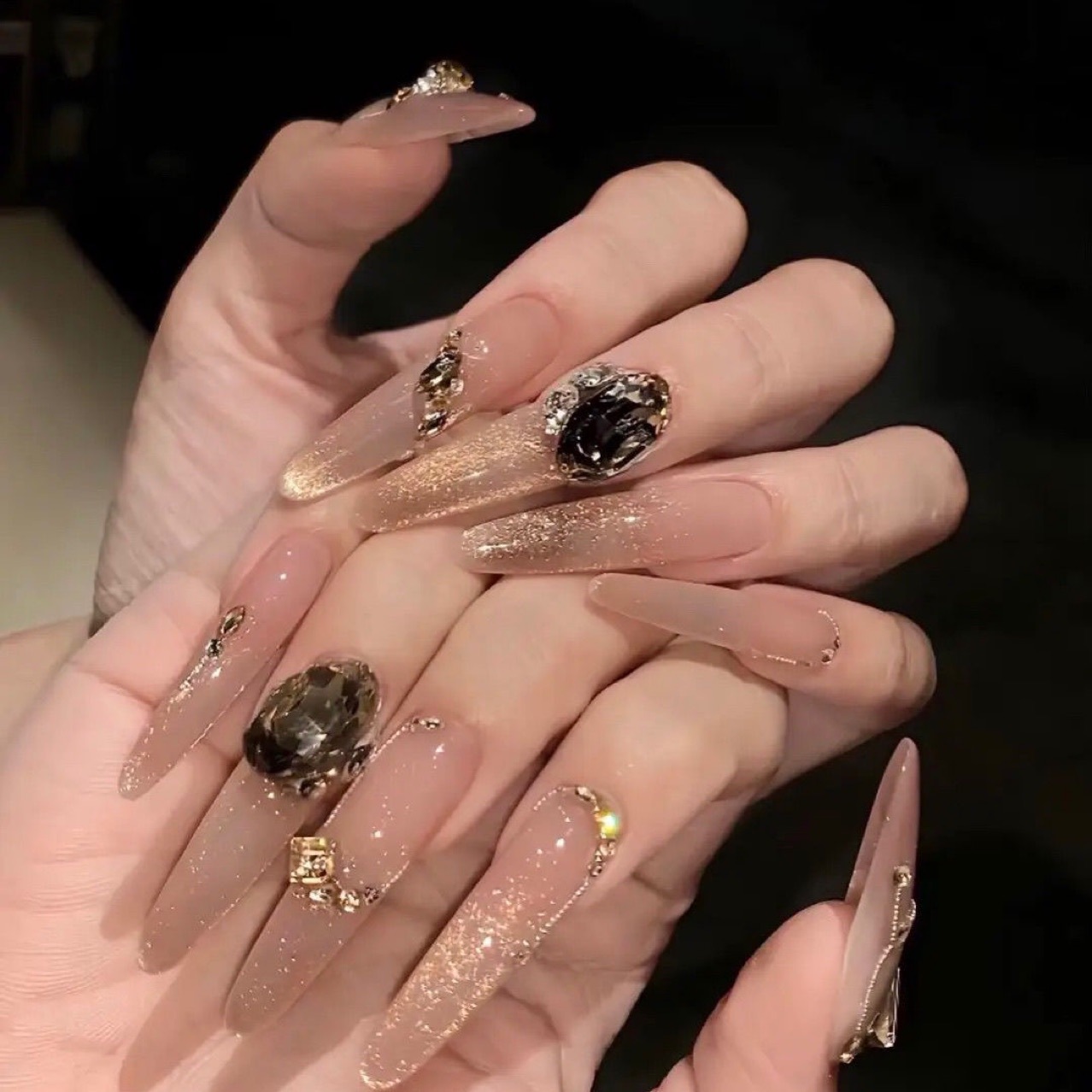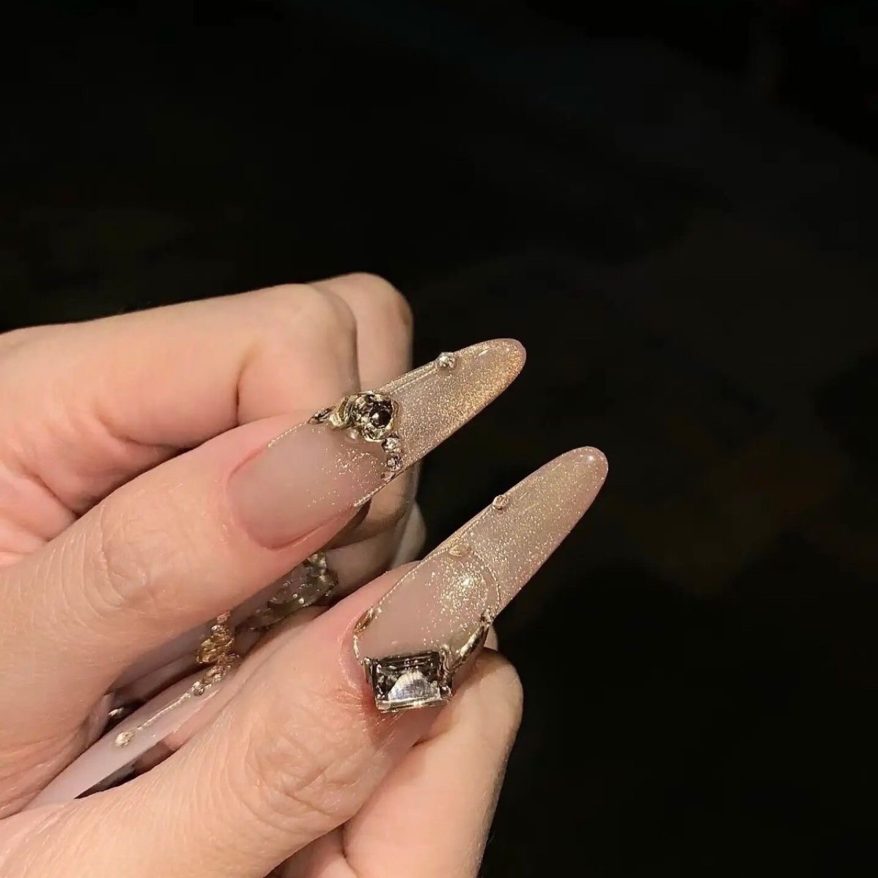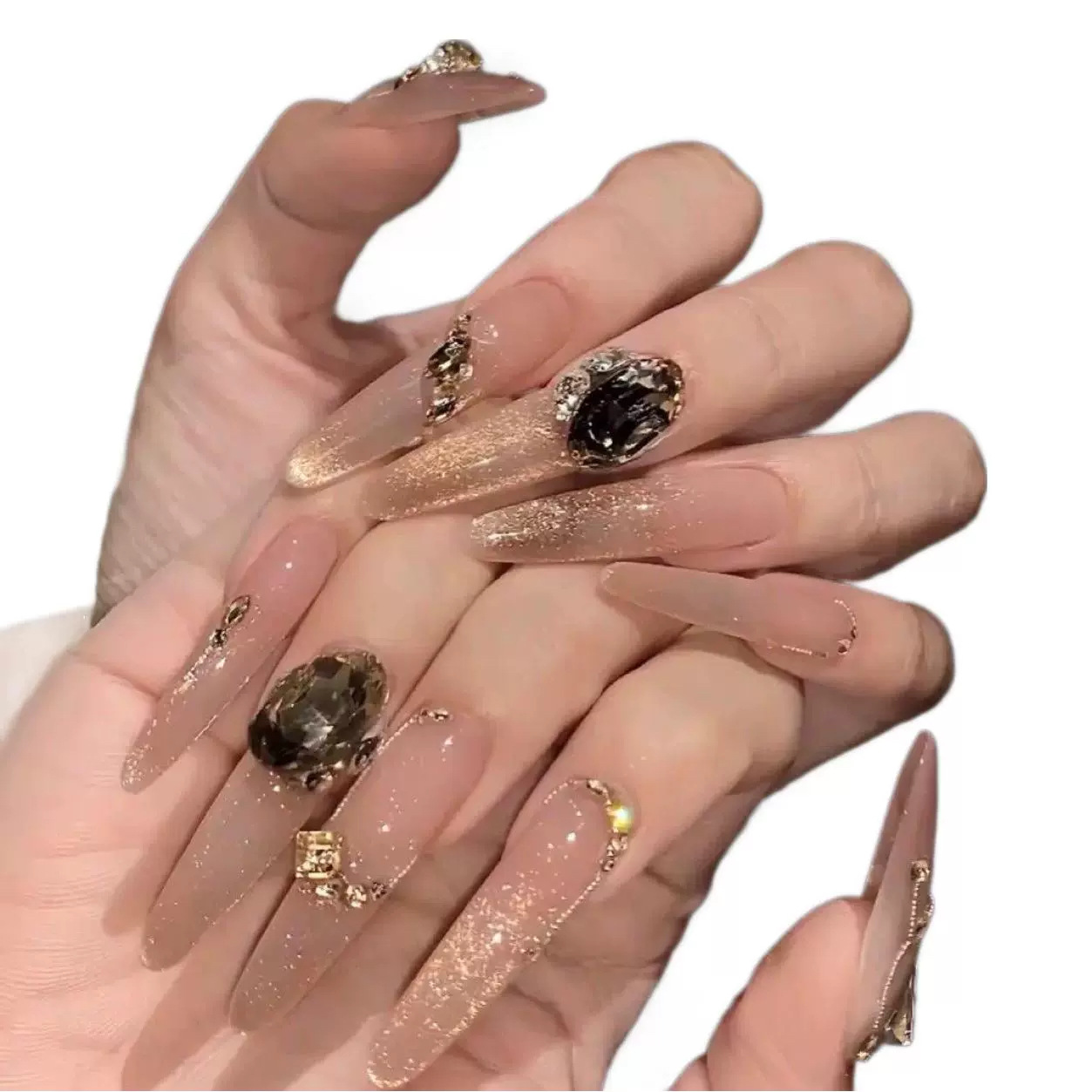 Handmade Nail Art with Cat Eye Effect, Champagne Glittering Diamonds, High-End Press-On Nails, Removable and Skin-Enhancing