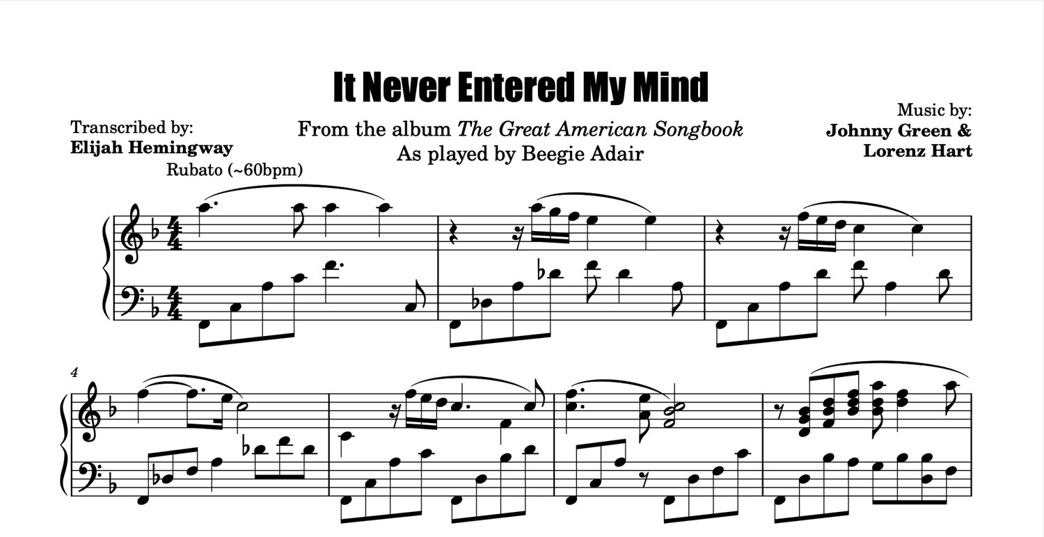 - A piano transcription of "It Never Entered My Mind", as played by Beegie Adair.