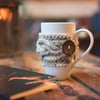 Cabled Cup Cozy is knit in one piece, side to side. Pick a unique button to make this cup cozy truly yours!