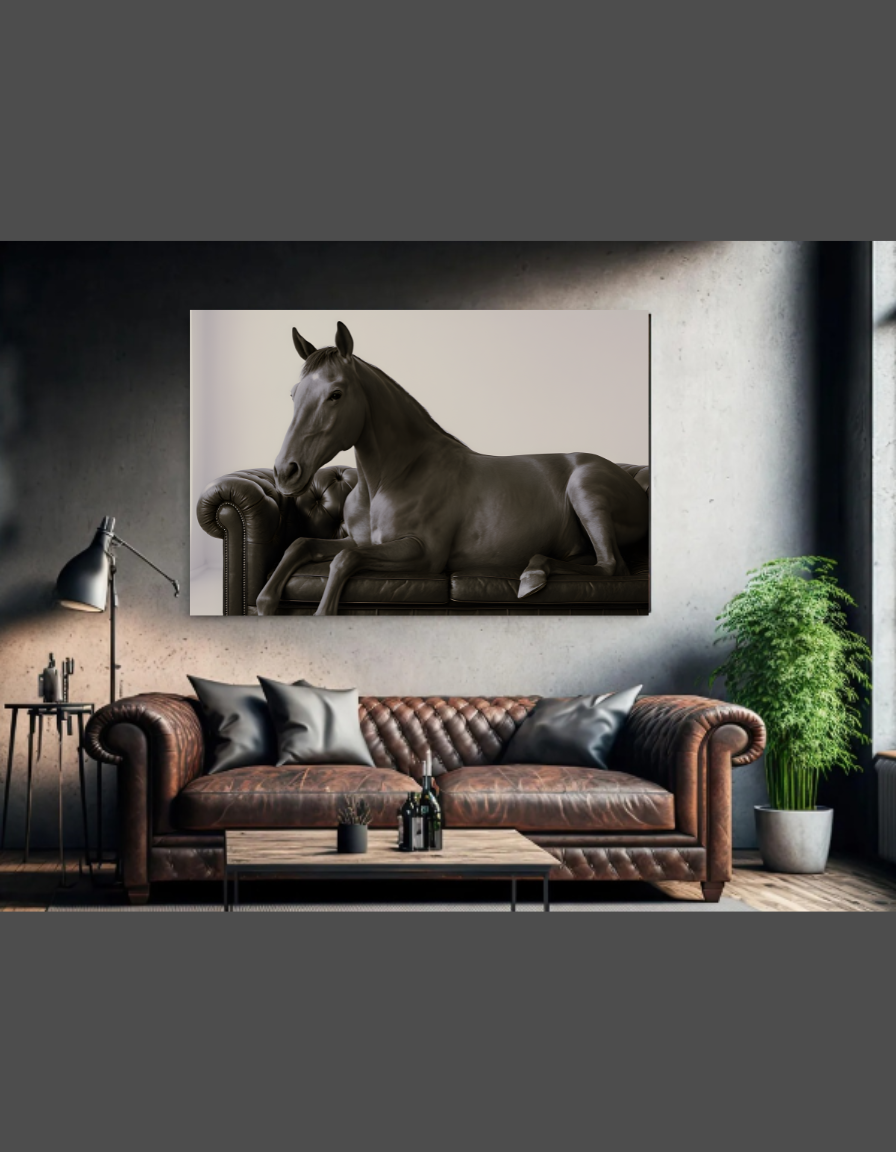 Elevate your home decor with this hilarious and eye-catching horse wall art featuring a majestic horse lounging on a sofa. This printable wall art is a high-resolution PNG 300 DPI digital download, perfect for creating stunning whimsical animal decor in your living room, bedroom, or office. Imagine a sleek horse on leather couch adding a touch of surreal humor and elegance to your space – ideal for horse lovers, equestrians, or anyone seeking unique funny horse art.