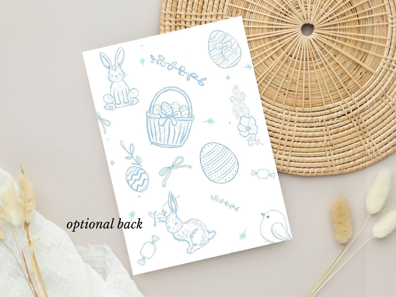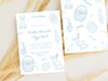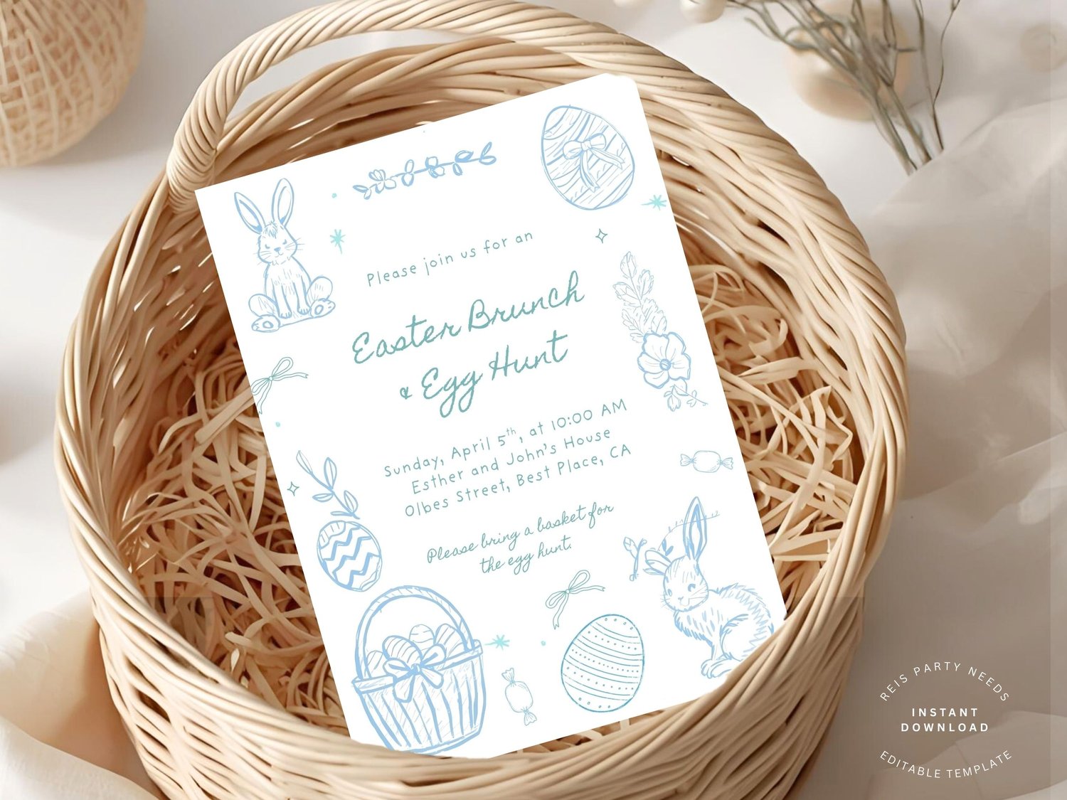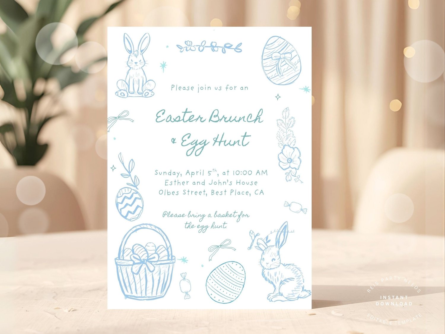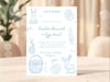 Designed with soft blue hand-drawn bunnies, eggs, florals, and baskets, this invite is perfect for elegant, minimalist, and modern Easter gatherings.