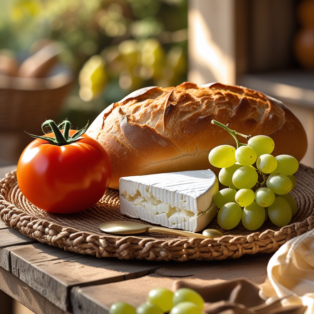 A vibrant and colorful still life photograph of a variety of appealing foods, including a juicy, ripe tomato, a crispy, golden-brown bread loaf, a wedge of creamy, white brie cheese, and a handful of fresh, green grapes, arranged artfully on a rustic, wooden table or woven basket, set against a warm, natural background, such as a sunny kitchen or outdoors in a garden, with soft, warm lighting and subtle shadows, evoking feelings of warmth, comfort, and appetizing freshness.
