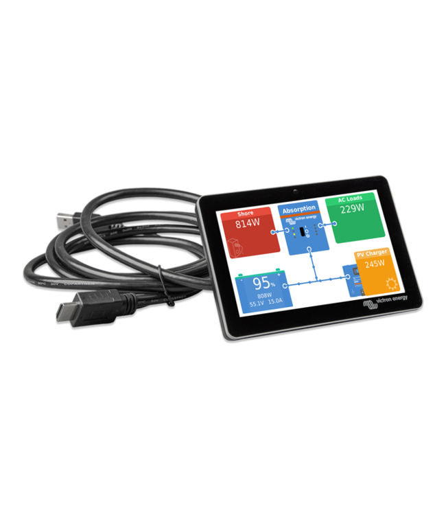 Voor de Cerbo GX zijn de Victron GX Touch 50 en GX Touch 70 beeldscherm accessoires. De 5"- en 7" inch touchscreen geven meteen een overzicht van uw systeem. Hiermee kunt u eenvoudig de instellingen aanpassen. Verbind de Cerbo GX met een kabel met de GX touch. Door de dunne waterdichte design, top monteerbare setup en eenvoudige installatie zorgt het voor veel flexibiliteit bij het creëren van een helder en schoon dashboard.