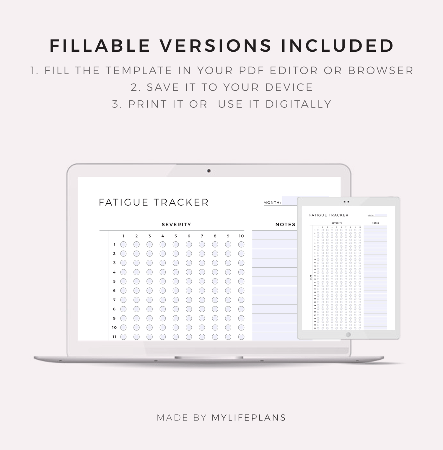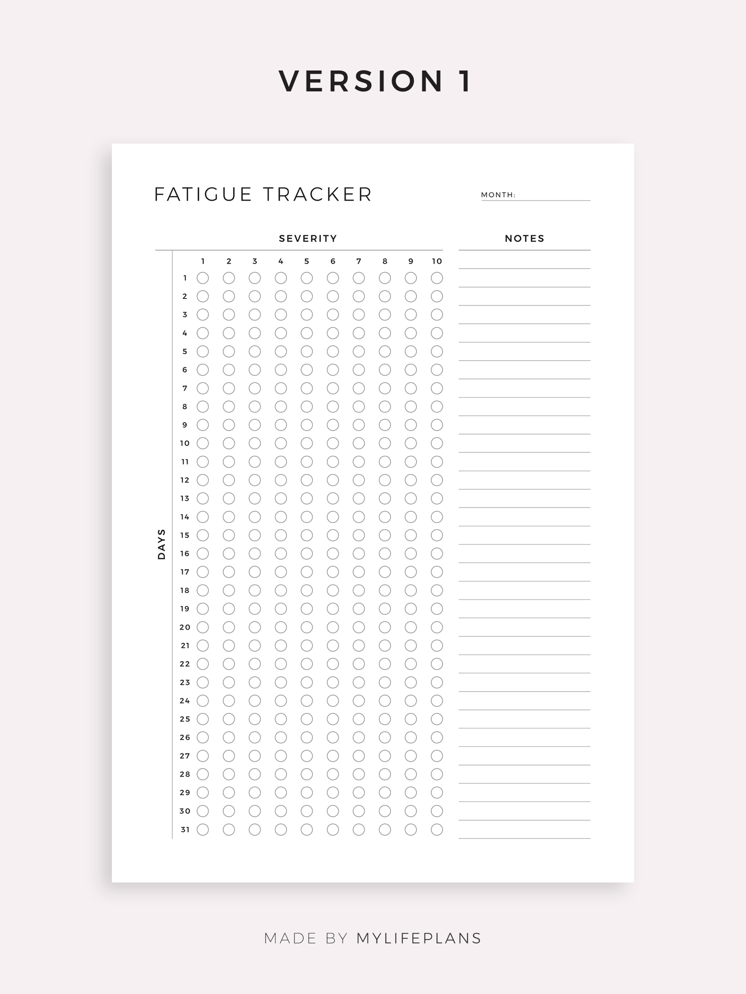 This is a printable monthly fatigue tracker — just download, print, and start using it right away.