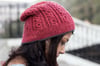 This hat, with twisted stitches and cables, is worked from the bottom up, has a ribbed brim and a little bit of slouch.