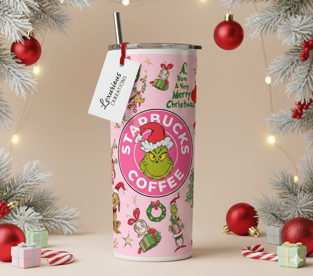Wrapped in soft pink with festive hand-drawn holiday doodles and a sassy green holiday creature, this tumbler brings winter cheer with a playful twist.