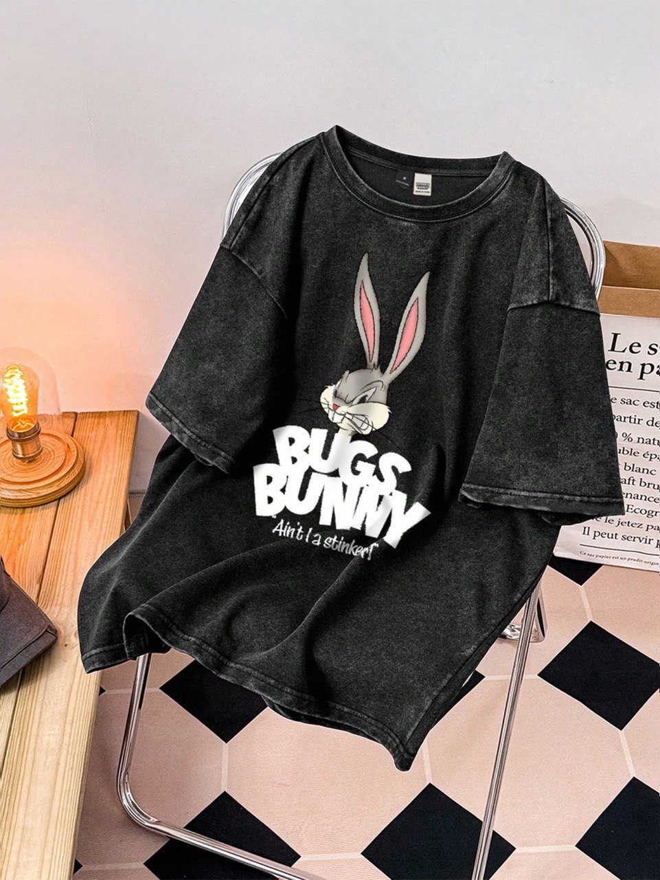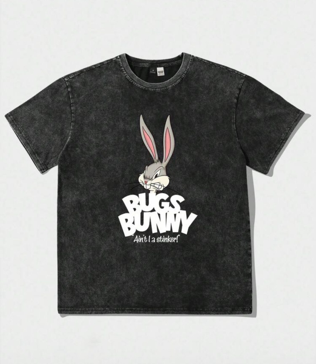 Show off your playful side with this vintage-style Bugs Bunny Tee! Featuring the iconic "Ain't I a stinker?" quote and a bold vartoon print on a washed black fabric, this shirt adds a cool retro vibe to any casual outfit. Perfect for Looney Tunes fans and streetwear lovers alike.
