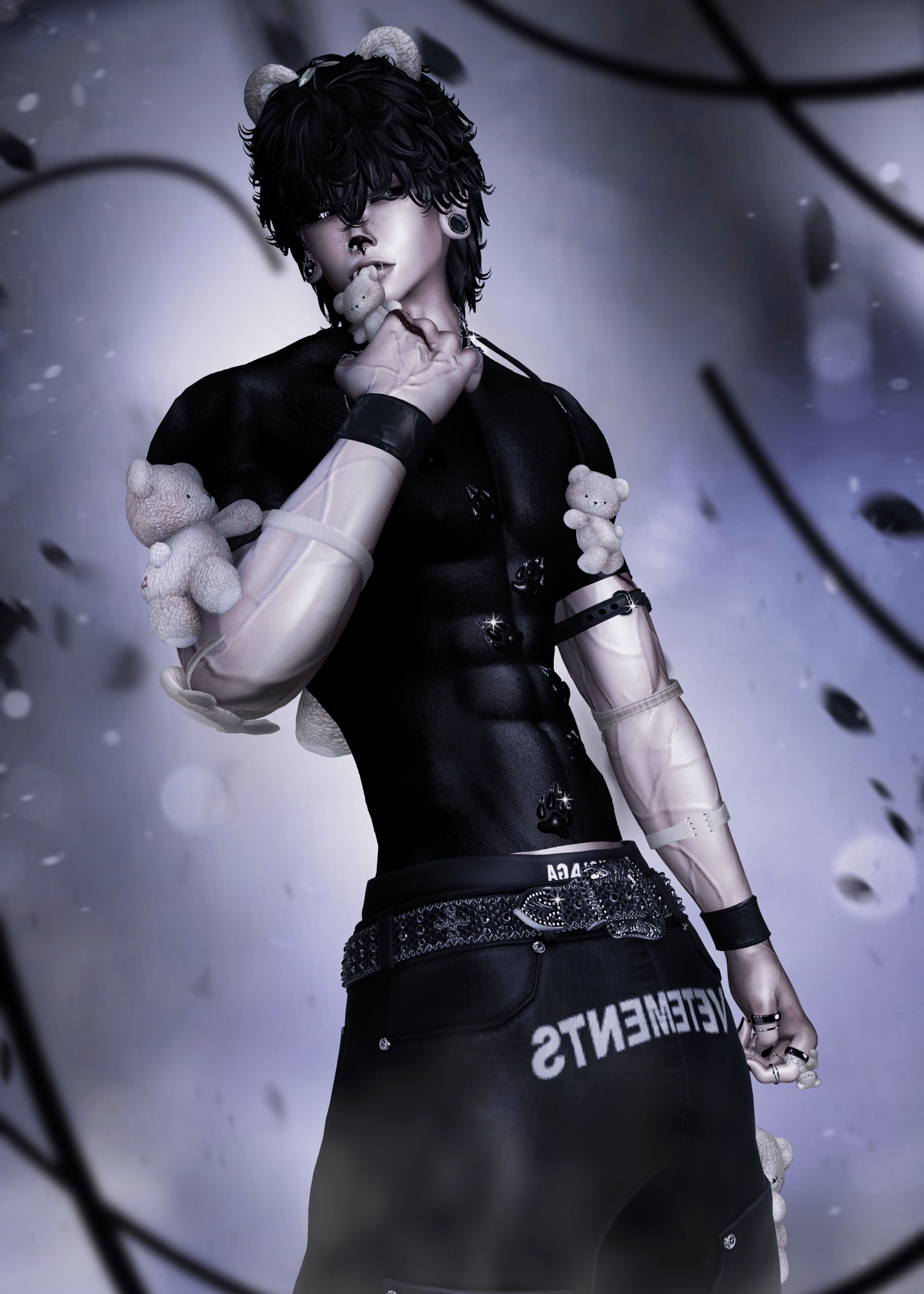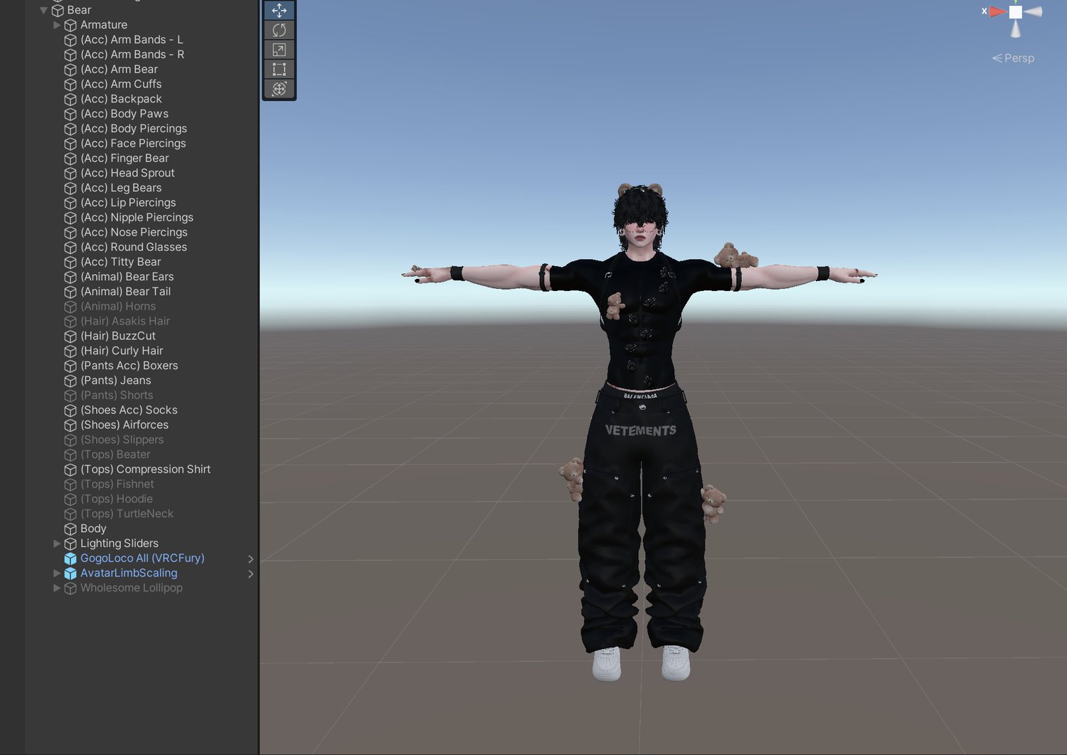 Toggles: No Tops - Fishnet - Compression Shirt - Tank Top - Hoodie - Ripped Sweater - Turtleneck - No Bottoms - Jeans - Sweats - Shorts - L Leggings - R Leggings - Boxers - Thong - BB Belt - Airforces - Jumbo Lace - Slippers - Uggs - Socks - Rings - Necklace - Body Piercings - Face Piercings - Lip Piercings - Mouth Needle - NIpple Piercings - Nose Piercings - Bear Ears - Bear Tail - Cat Ears - Cat Tail - Horns - Honey Pack - Mouth Bear - Glasses - Round Glasses - Arm Bands L - Arm Bands R - Arm Bear - Arm Cuffs - Backpack - Body Paws - Elbow Pads L - Elbow Pads R - Finger Bear - Head Sprout - Leg Bears - Paw Bands L - Paw Bands R - Titty Bear - Buzz Cut - Curly Hair - Spike Hair - Curly Bun - Asak's Hair - Julian's Hair - Face Tracking Menu - Lighting Menu - Lollipop Menu - GoGo Loco Menu - Limb Scaling