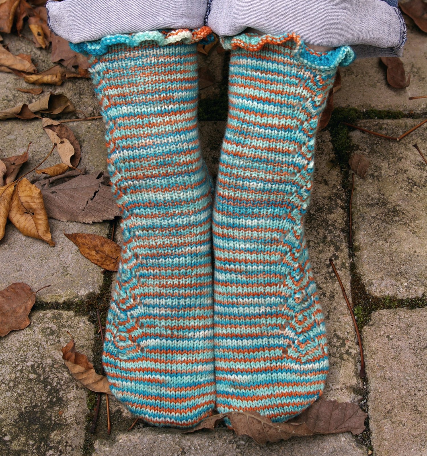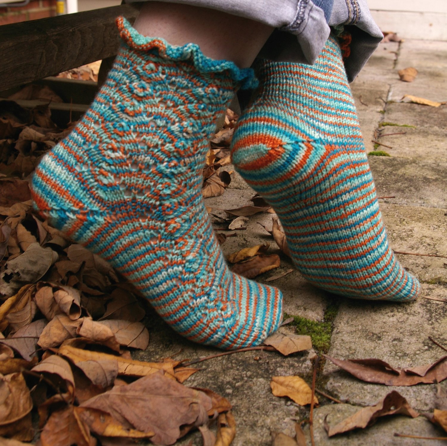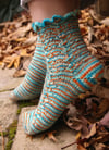 You’ll work these socks from the toe up, with shaping to differentiate between right and left. One panel of the lace is placed on the outer side of the instep, with a second panel starting at the ankle. The heel is worked with a gusseted short row technique. It’s all topped off with a ruffled cuff meant to invoke the crimped top of my first goldfish bowl.