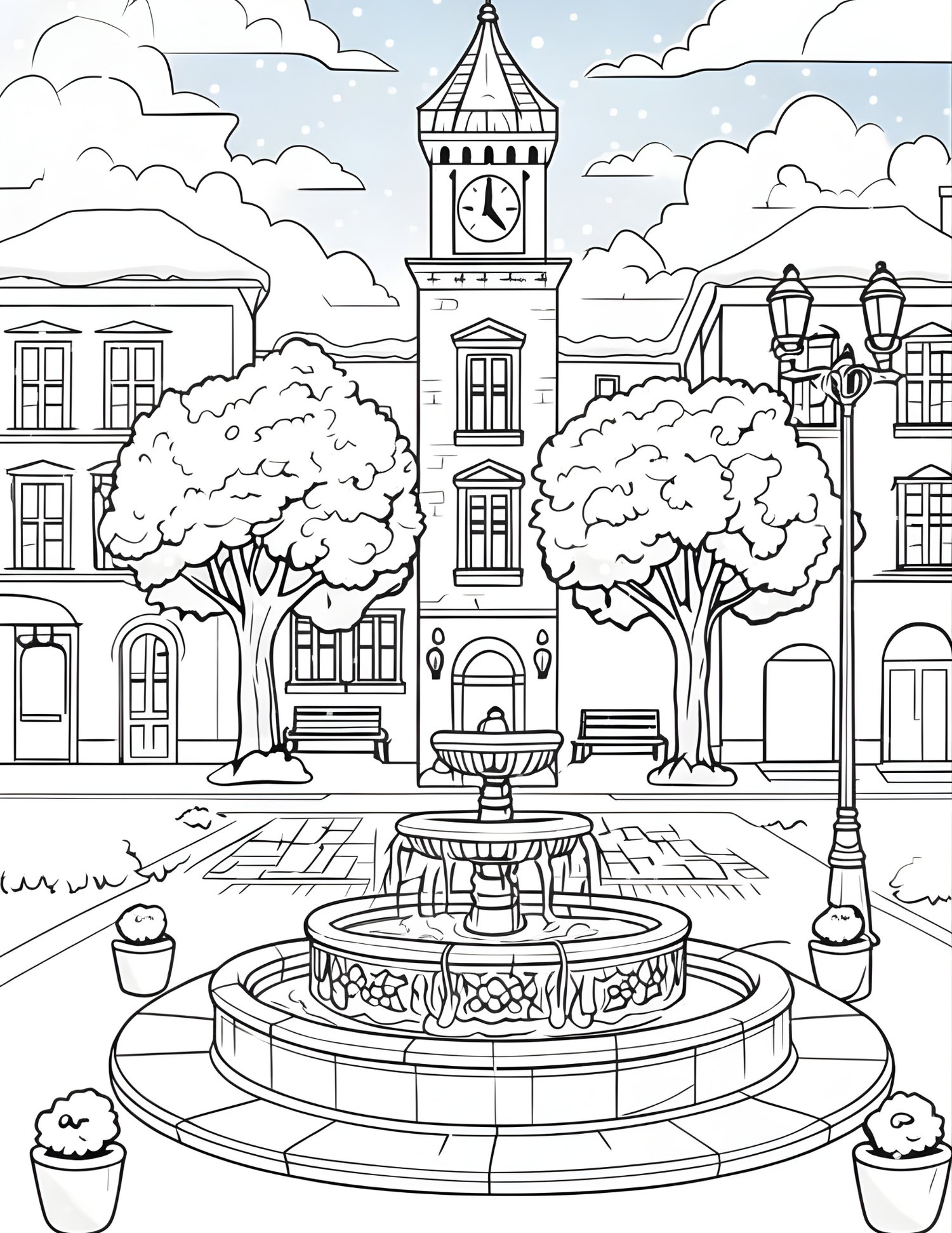 Bring a touch of small-town charm to your coloring collection with this snowy city hall coloring page featuring a beautiful fountain. Perfect for cozy winter nights, holiday relaxation, or mindful coloring sessions.