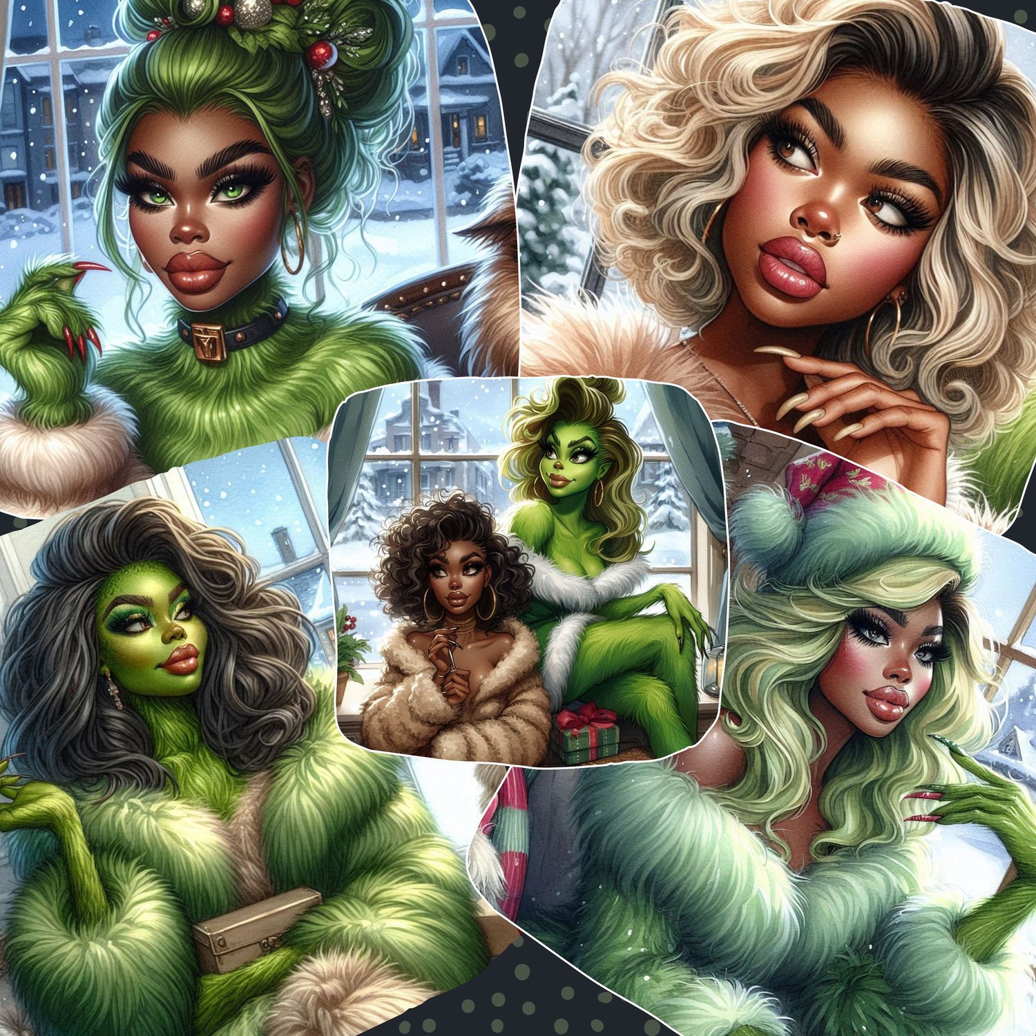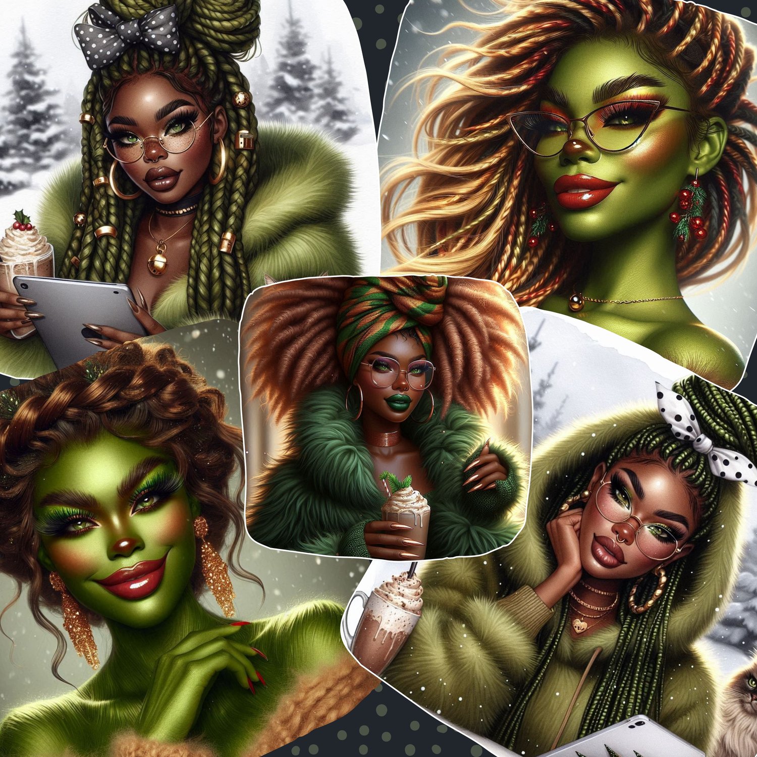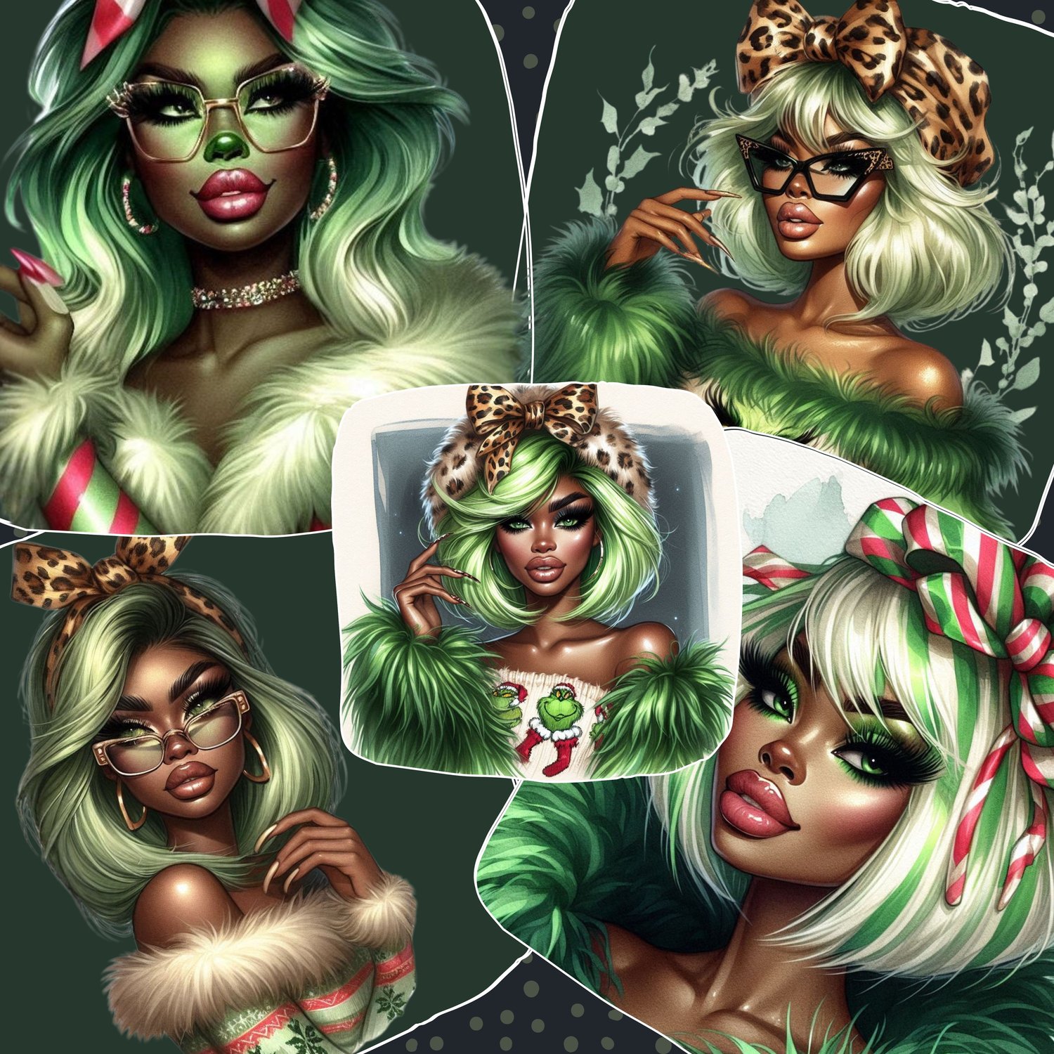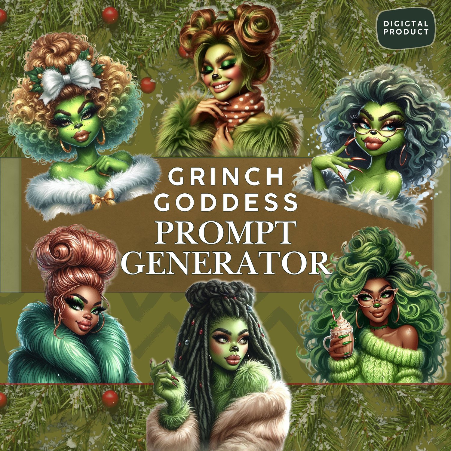 Design your own divine feminine Grinch with endless festive flair. This powerful prompt generator lets you build stunning, high-fashion Grinch Goddess characters inspired by luxe fur textures, glamorous makeup, bold hairstyles, plush winter fashion, and exquisite holiday details. Mix and match styles—braids, buns, curls, dramatic glasses, lavish coats, cozy sweaters, frappes, G-Wagons, and sparkling snowy scenes—to create unlimited variations. Perfect for clipart, stickers, digital planners, branding, and holiday collections. Bring your dream Grinch Goddess to life with effortless customization and magically chic results.