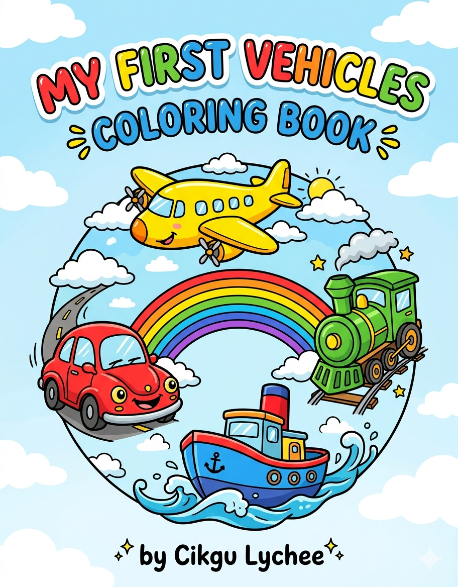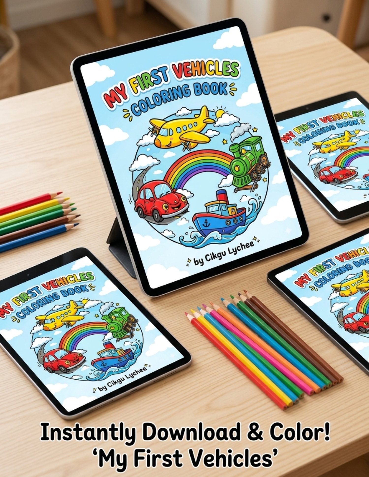 MY FIRST VEHICLES COLORING BOOK," a digital collection of 32 beautifully designed coloring pages for kids.