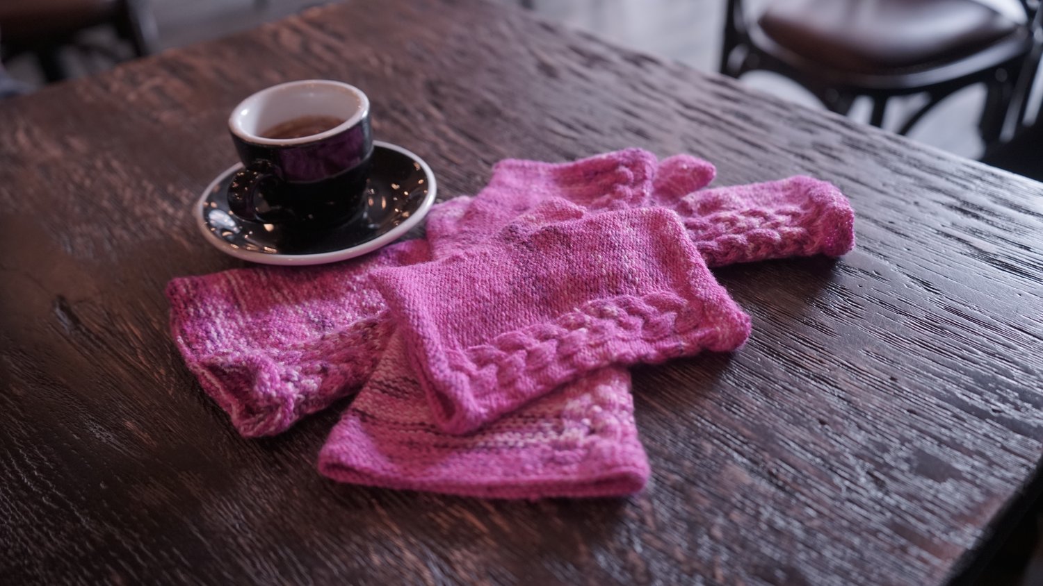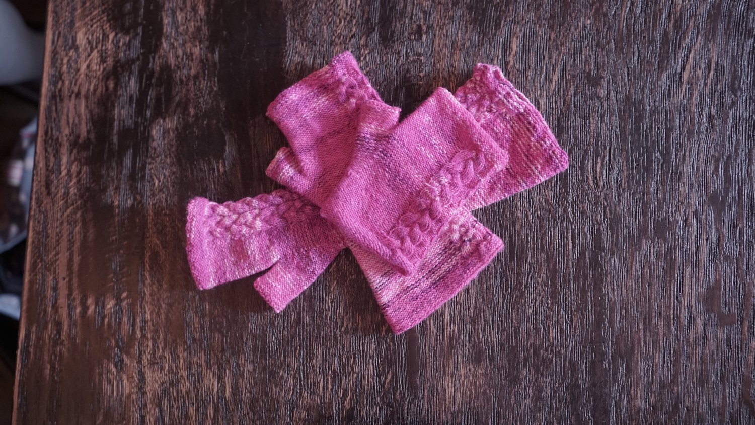 For these mitts, the cable pattern is a braid of three strands repeated three times around the mitts. There are 3 length options appropriately named 1 Shot, 2 Shots, or 3 Shots.