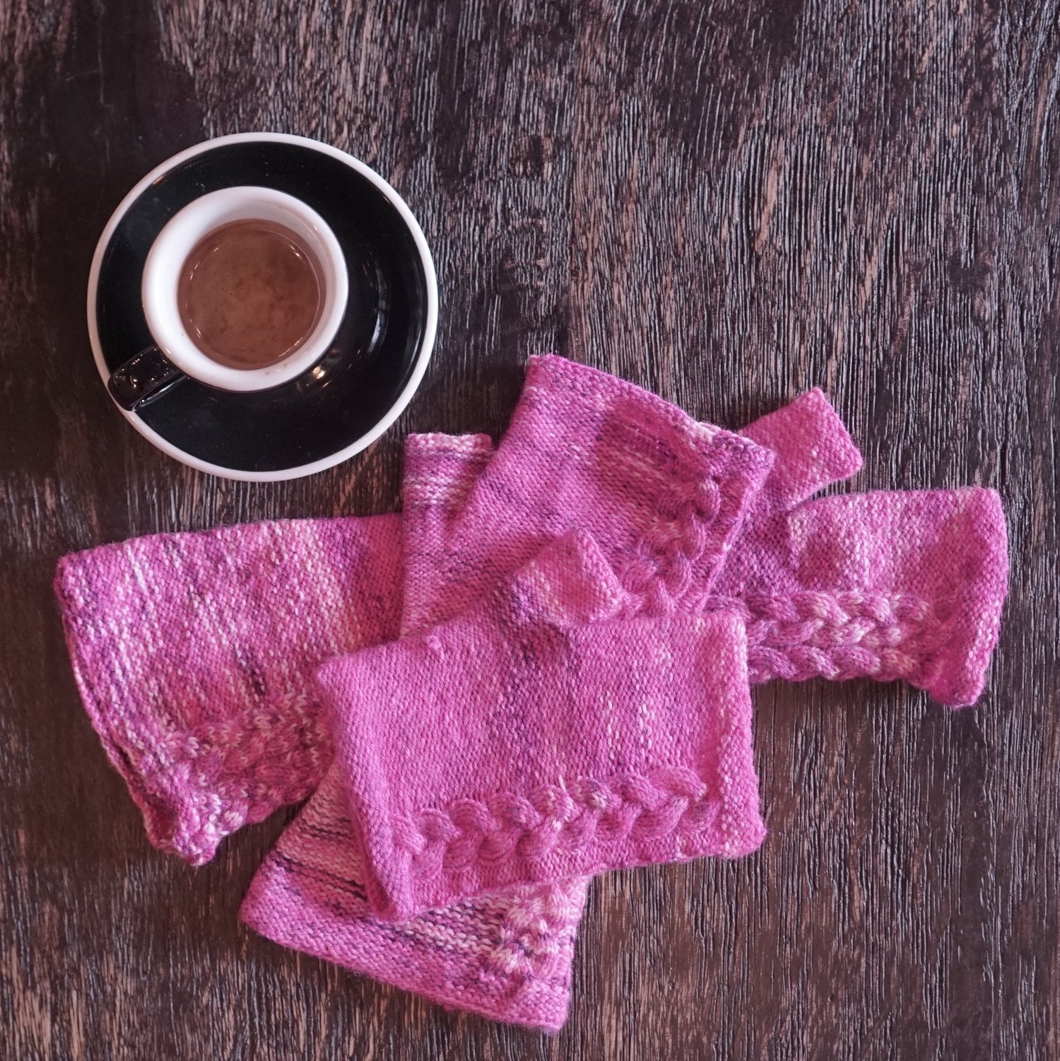 When I thought of designing a pair of fingerless mitts, espresso shots came to mind. Espresso shots are created by forcing almost boiling water through finely ground coffee beans.