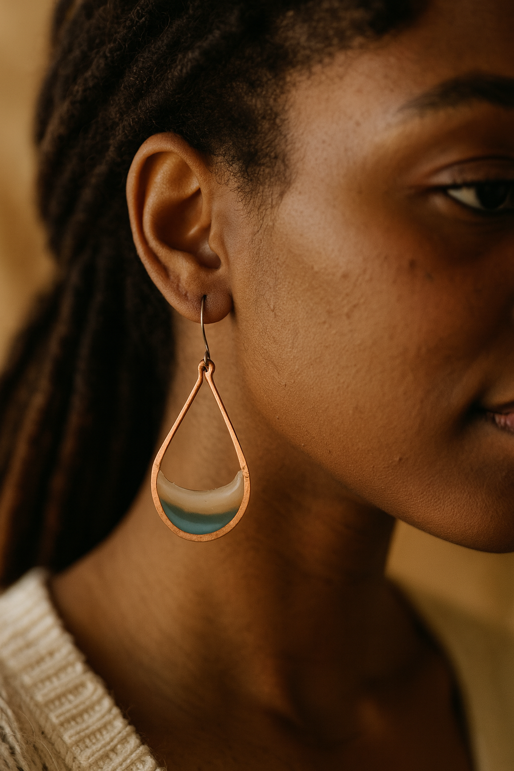 Bring a touch of earthy elegance to your look with these handcrafted teardrop earrings. Each pair is hammered and shaped from solid copper and filled with layers of resin in soft cream, sand, and ocean blue tones, creating a subtle wave effect inside a warm metal frame.