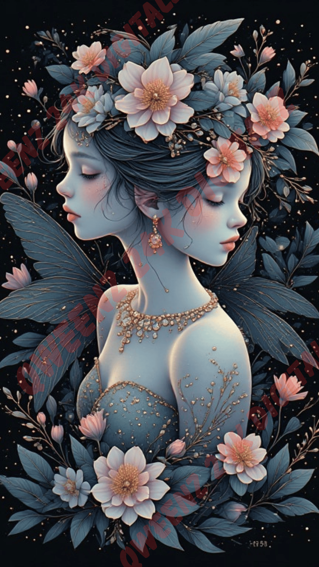 “The Twin Seraphim: Floral Guardians of Grace™” is a breathtaking, hyper‑detailed digital artwork featuring two ethereal feminine figures standing back‑to‑back, adorned with radiant floral crowns, shimmering wings, and luxurious gold accents.