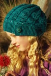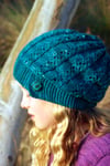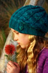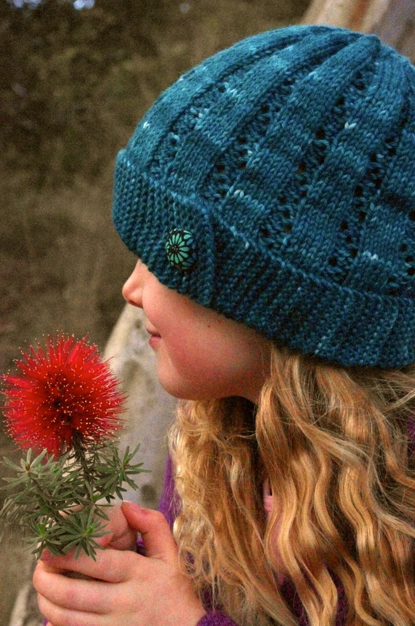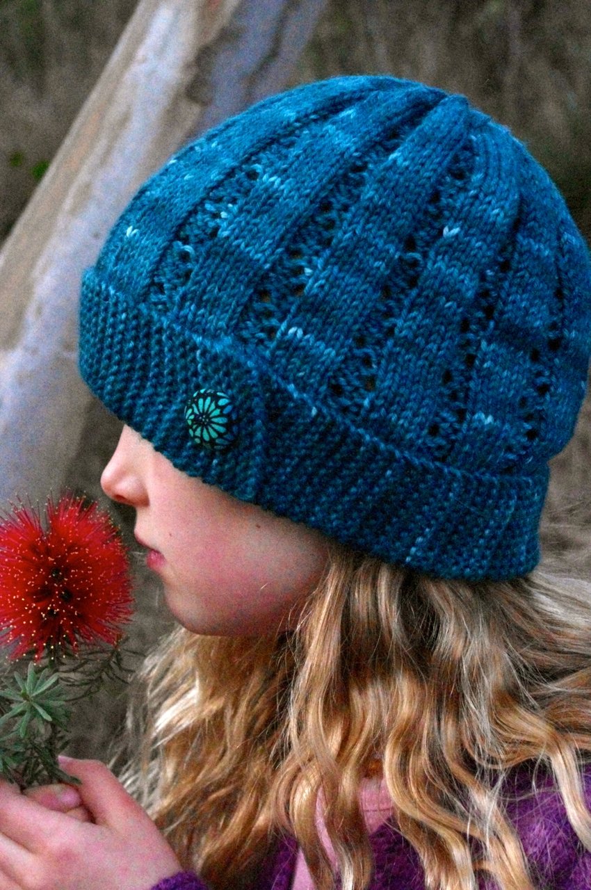 The brim is worked as a long strip of garter stitch first. Stitches are then picked up along its edge to form the body of the hat. Sassafras uses the same lace pattern as the Olinda cardigan. The pattern works as a eight stitch repeat, which increases to nine stitches over the first three rounds.