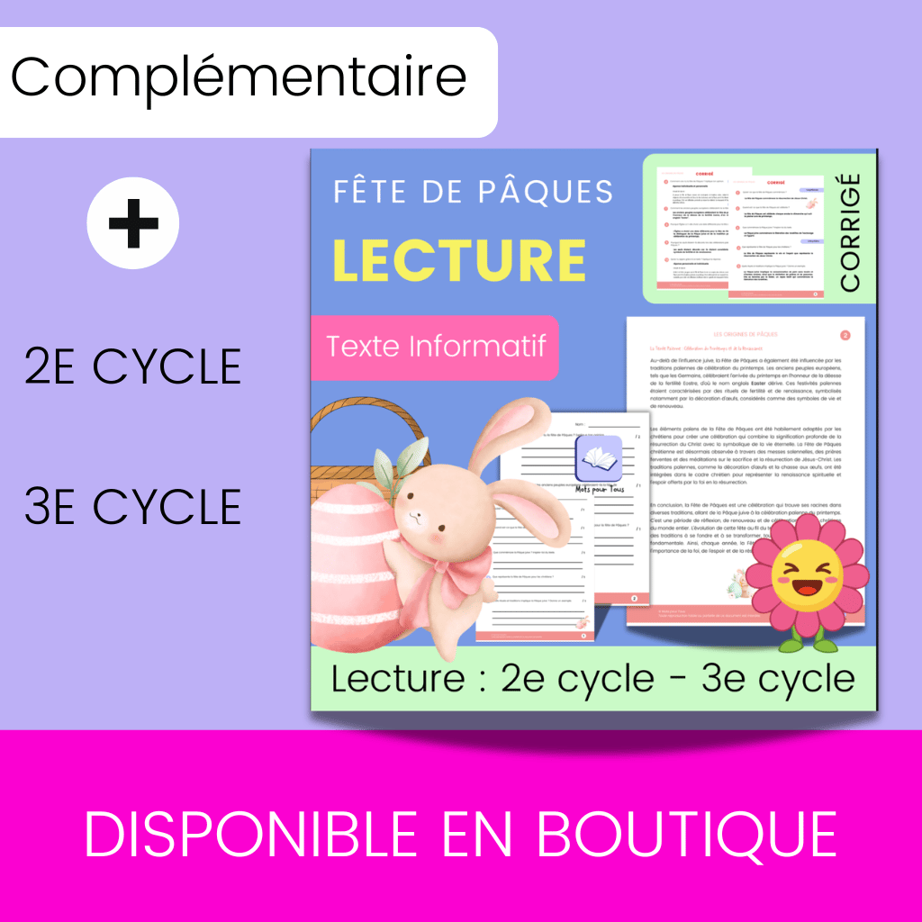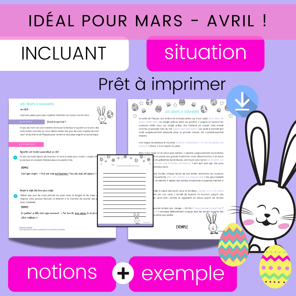 Conçue pour les élèves du 2e et du 3e cycle du primaire, cette ressource s’intègre facilement aux ateliers d’écriture, aux projets thématiques de Pâques ou aux activités d’enrichissement.