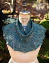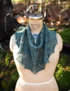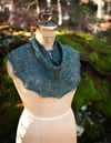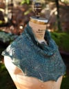 This one uses my favorite shape. It’s broad at the bottom, so it settles nicely on your shoulders, and narrows towards the top, so you’re not drowning in extra fabric up by your face. All the decreases are tucked cleverly away inside the lace pattern, which is both satisfyingly tidy and means you can stop the cowl at a couple of different points to control how tall it is.