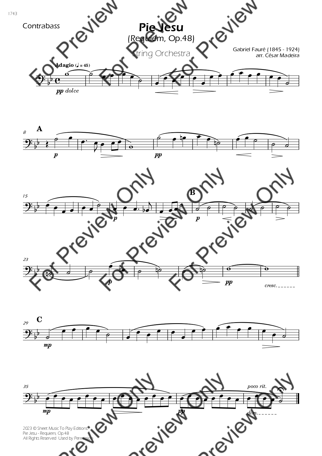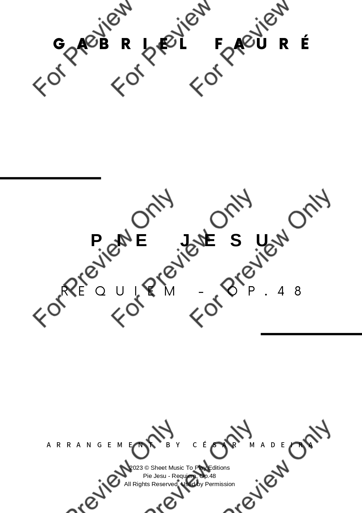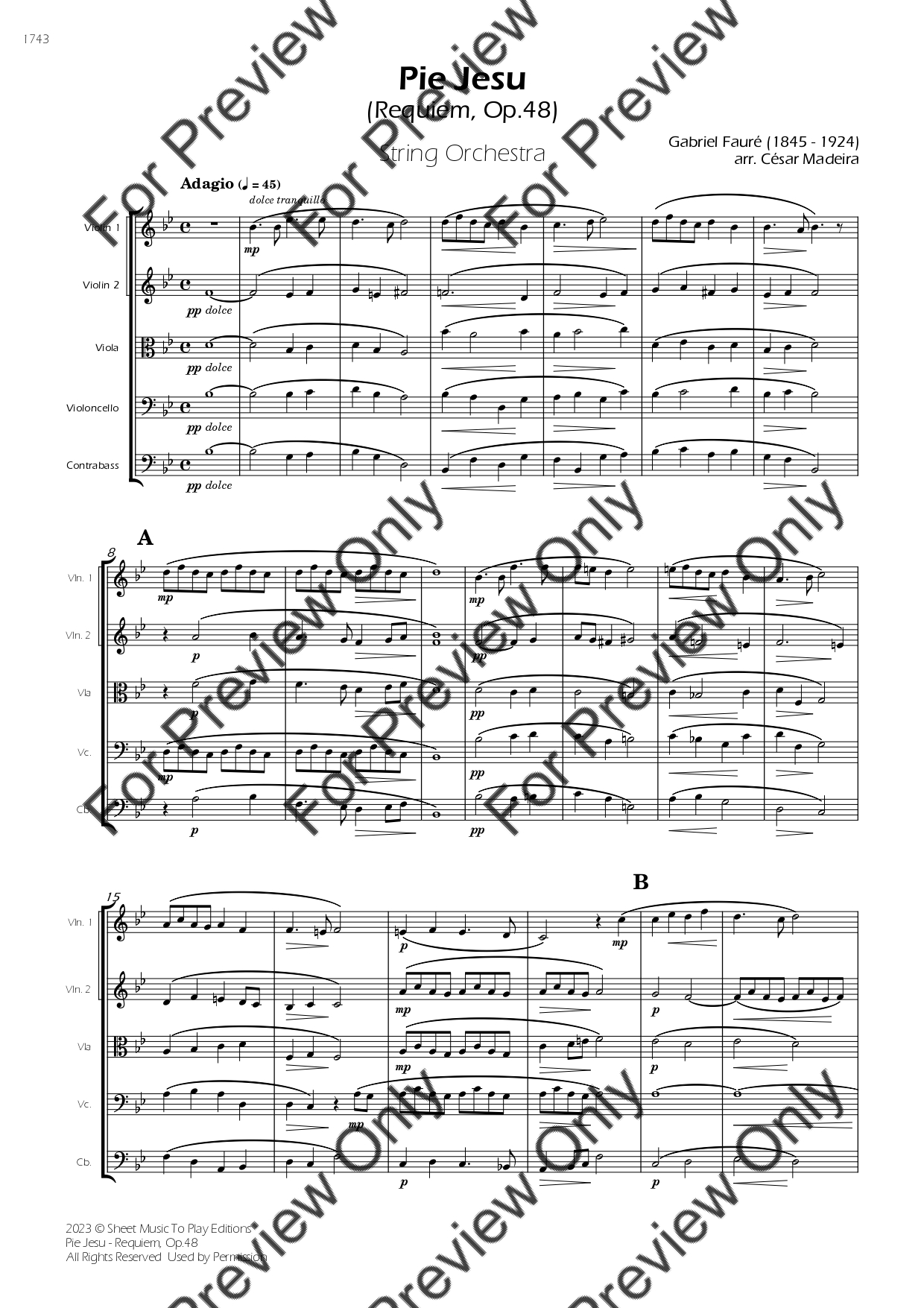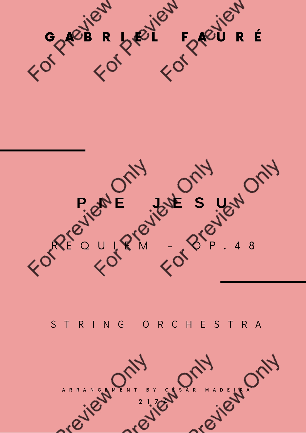 Pie Jesu from Requiem, Op.48 by Gabriel Fauré. Arrangement for String Orchestra - Violin 1, 2, Viola, Violoncello and Contrabass. With Full Score and Individual Parts. Have fun!
