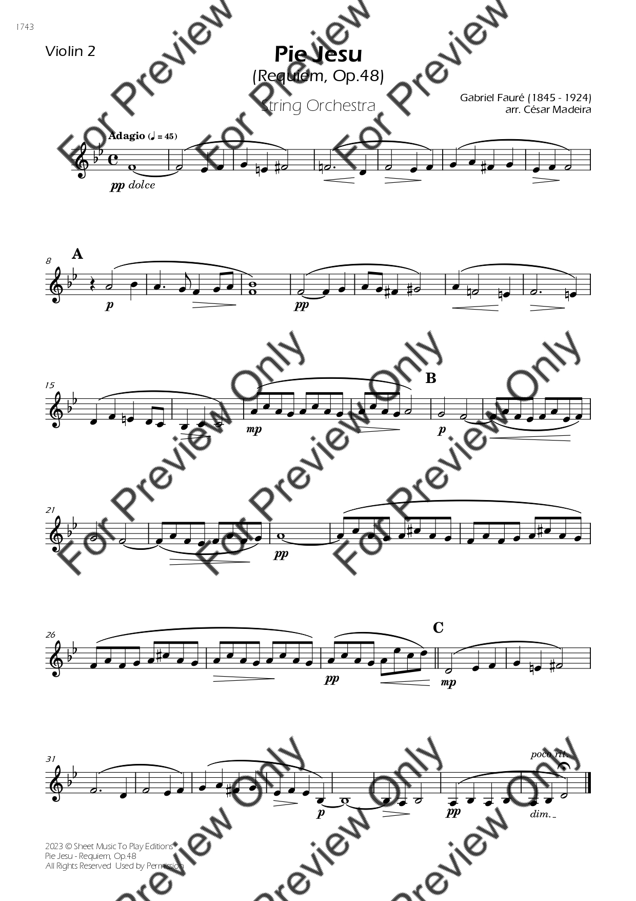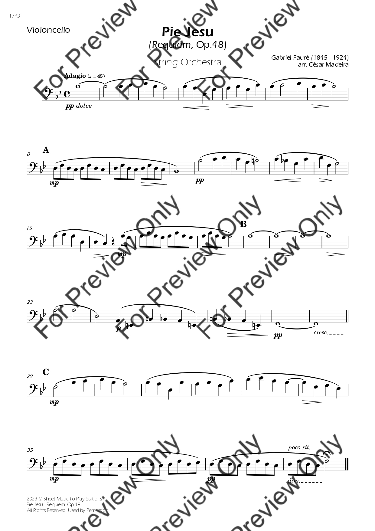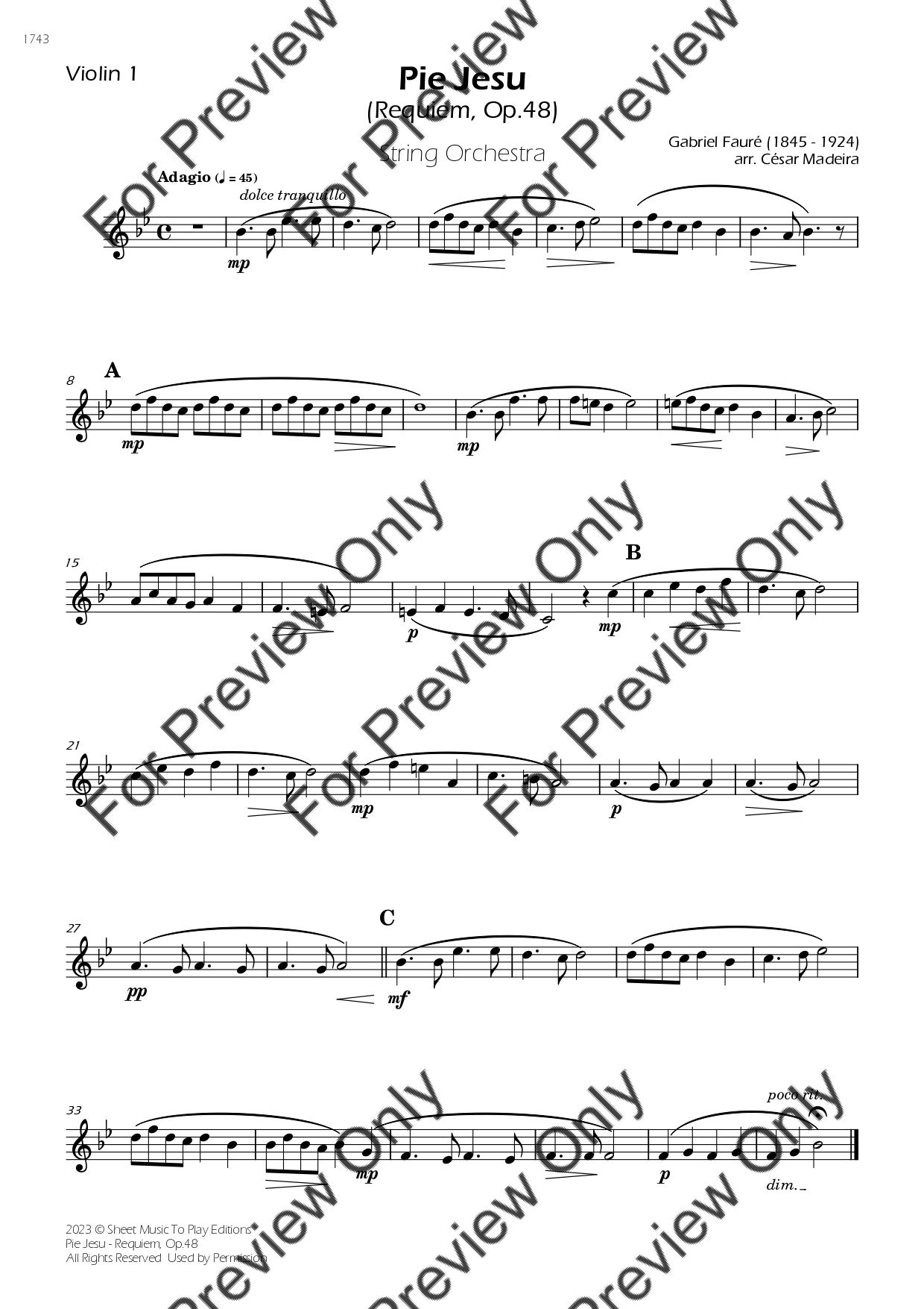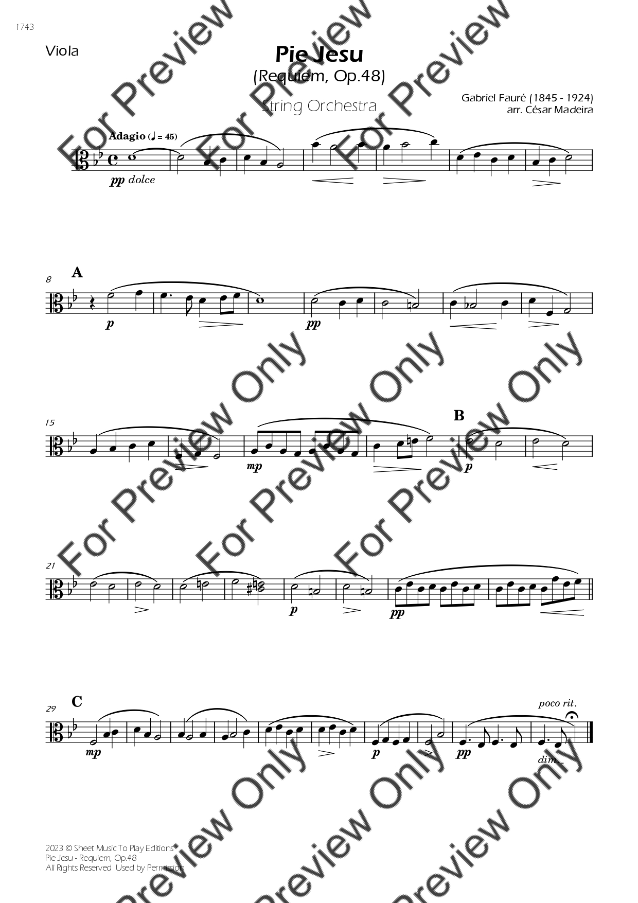 Pie Jesu from Requiem, Op.48 by Gabriel Fauré. Arrangement for String Orchestra - Violin 1, 2, Viola, Violoncello and Contrabass. With Full Score and Individual Parts. Have fun!