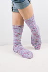 These socks are knit from the cuff down, with a heel flap and gusset and wide toe that is finished with grafting. The knit/purl stitch pattern is both written and charted.