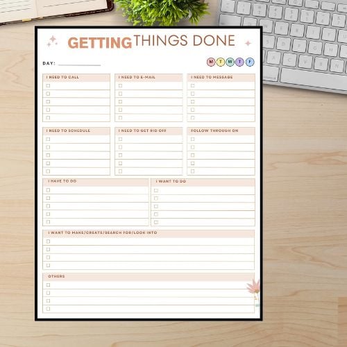 The Getting Things Done worksheet is designed to create instant clarity and reduce mental clutter by breaking your to-do list into meaningful action categories—like calls, emails, scheduling, things to follow up on, and even things you want to make or look into. It’s not just about tasks—it’s about organizing your brain so you can focus, follow through, and feel accomplished.