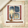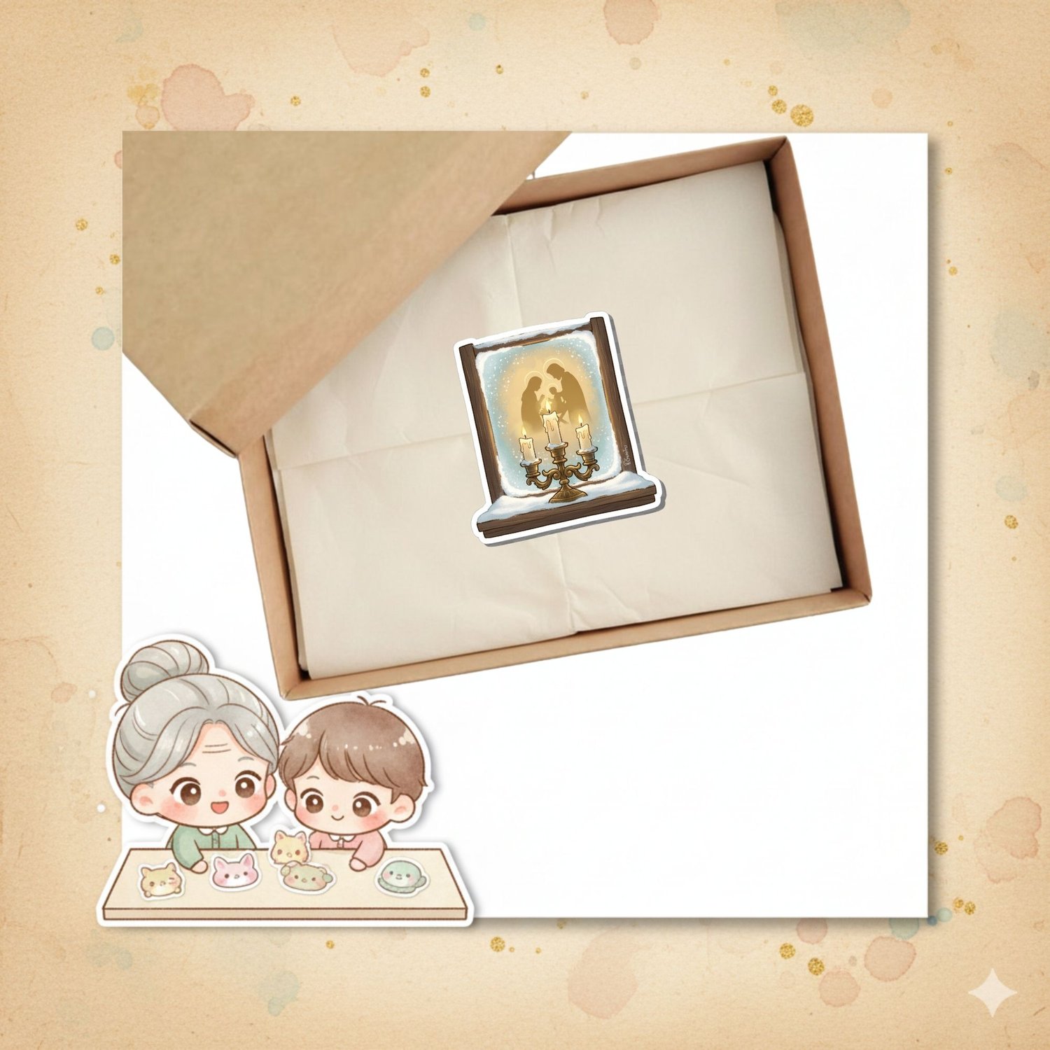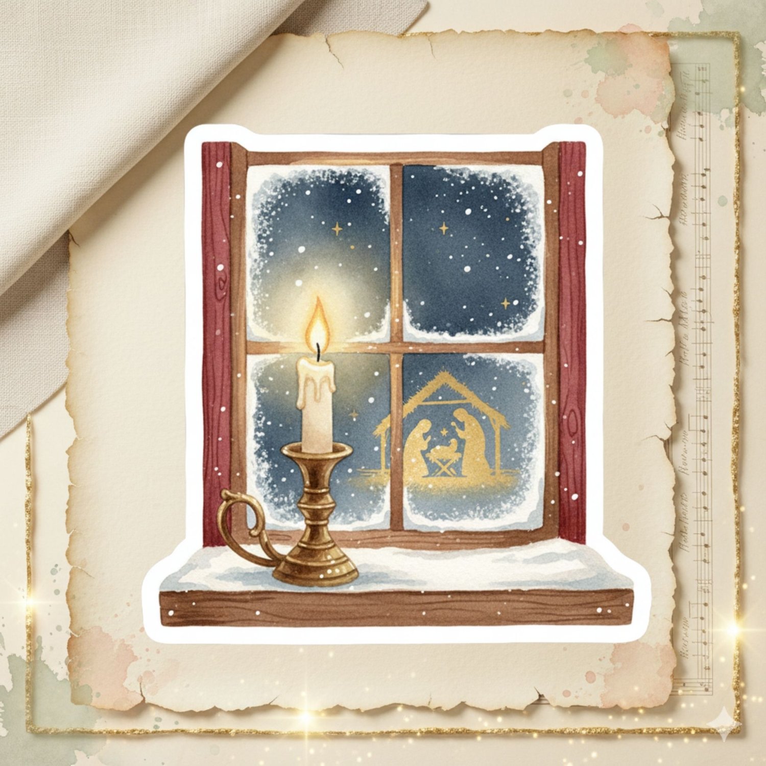 A soft watercolor sticker capturing the sacred stillness of Christmas night — a single candle glowing in a frosted window, its light revealing the faint reflection of the Nativity.