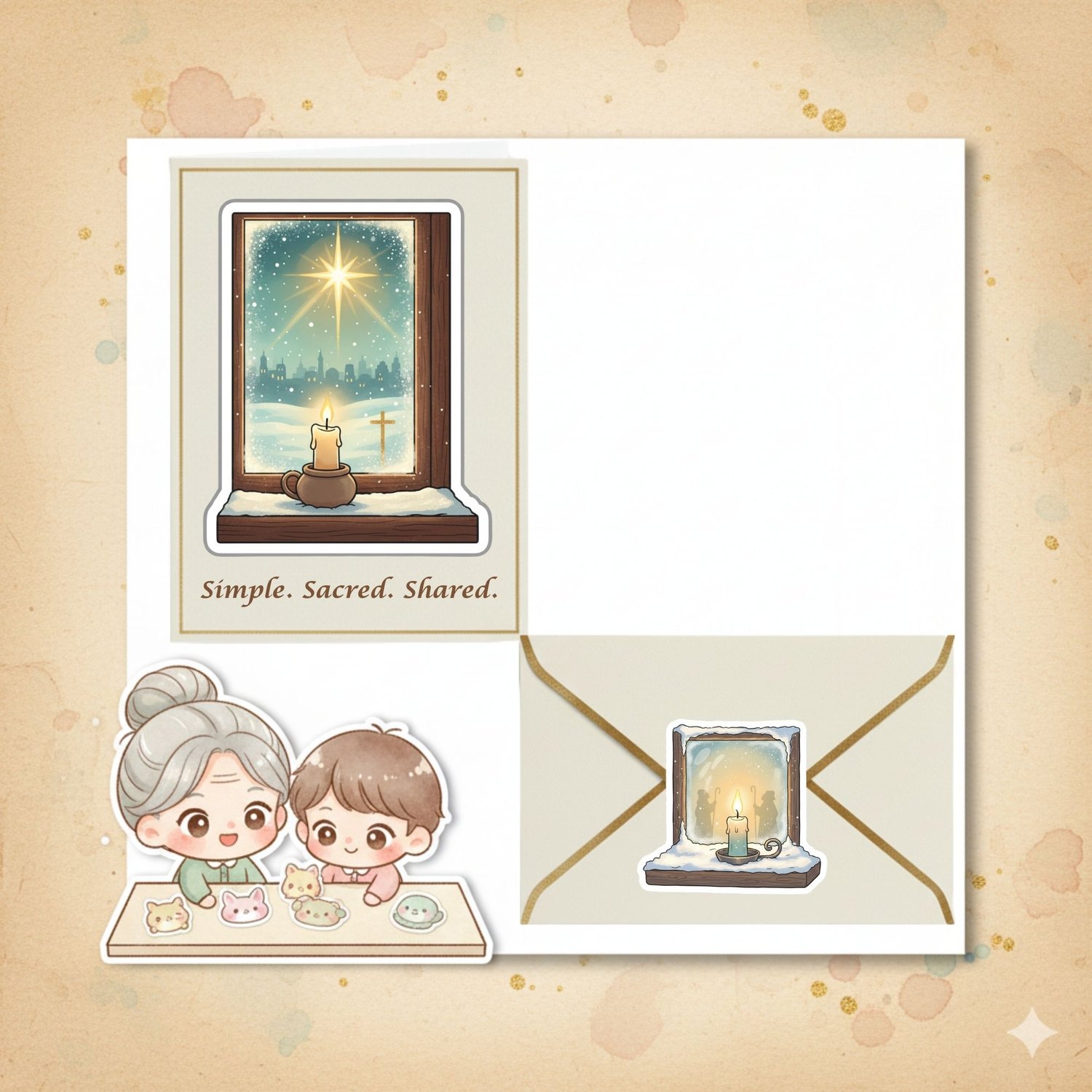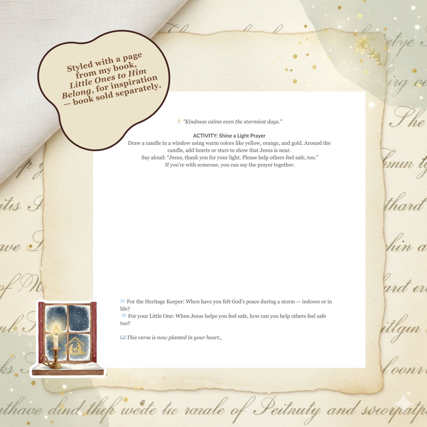 This digital sticker set features six candle-lit window scenes, each glowing with peace, reflection, and winter warmth. Perfect for faith-based crafts, Bible journaling, printable projects, and Sacred Legacy Studio books like Little Ones to Him Belong.