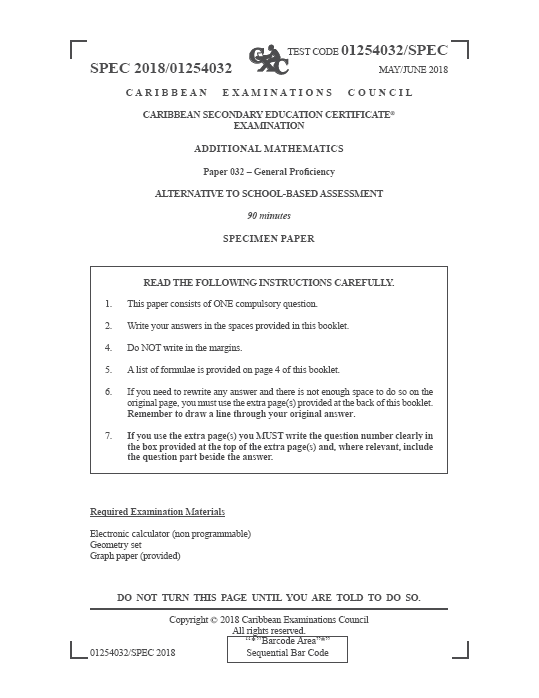 Specimen Paper 032 of the CSEC Additional Mathematics Examination, effective June 2021. Copyright by Caribbean Examinations Council.