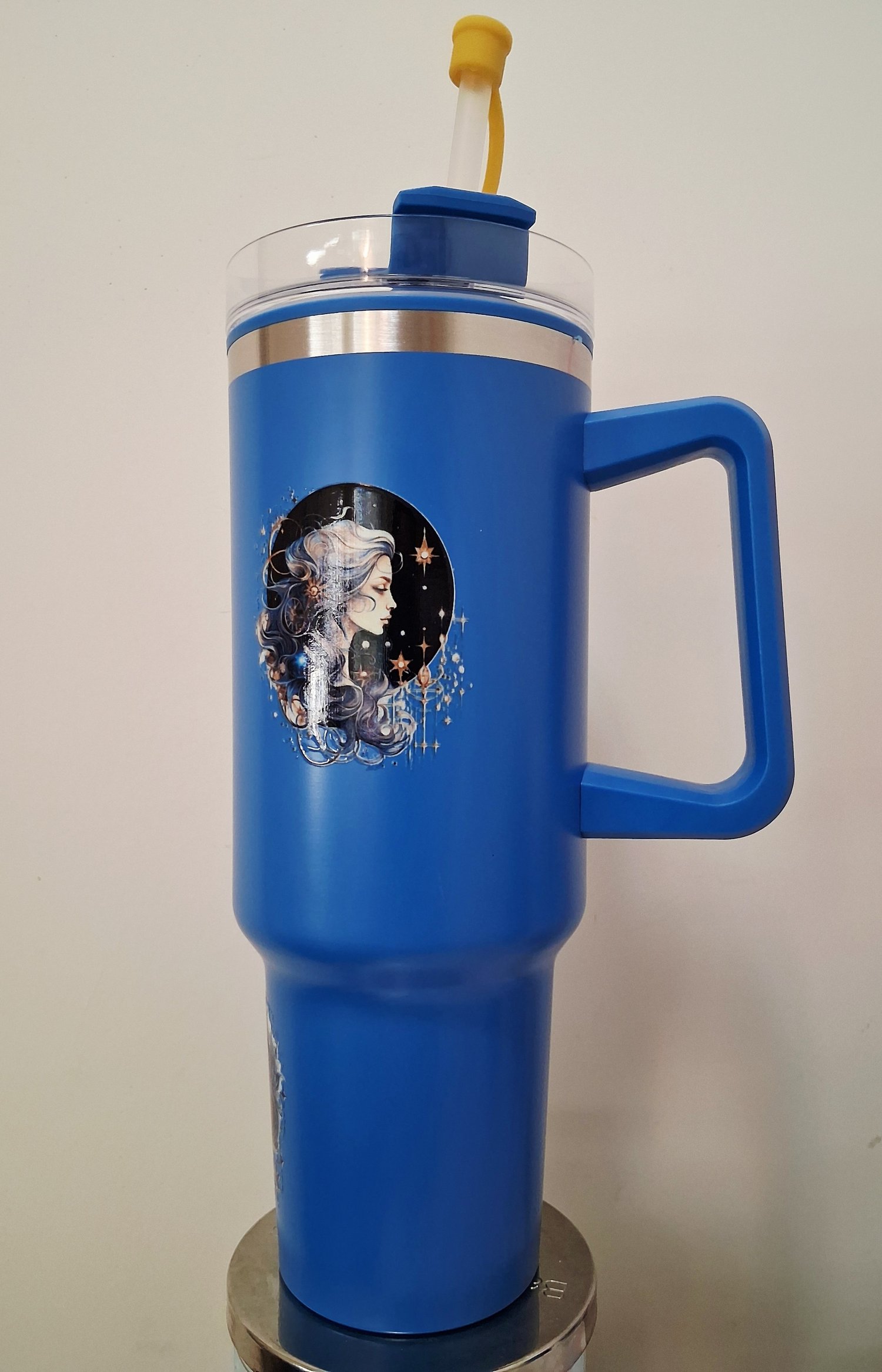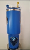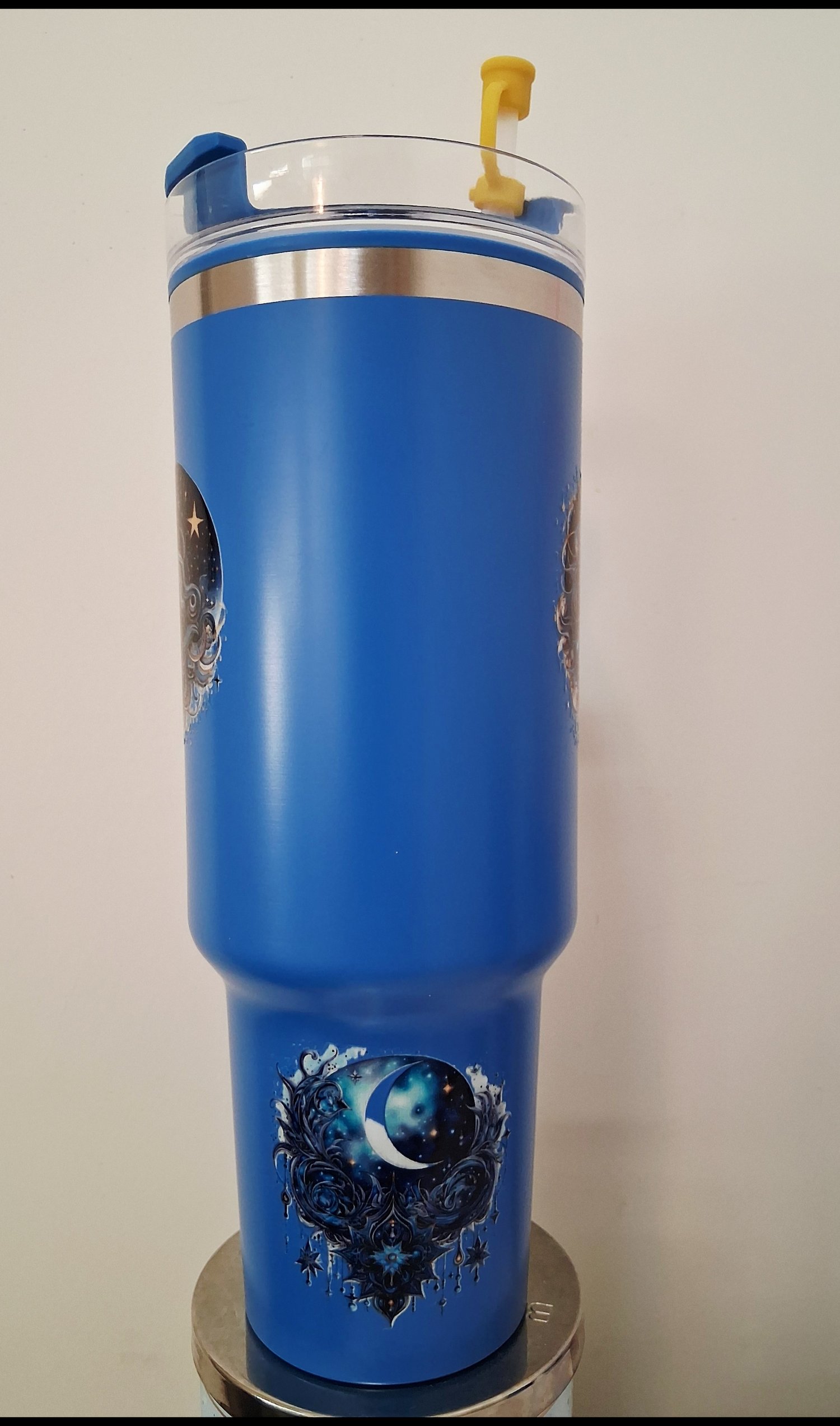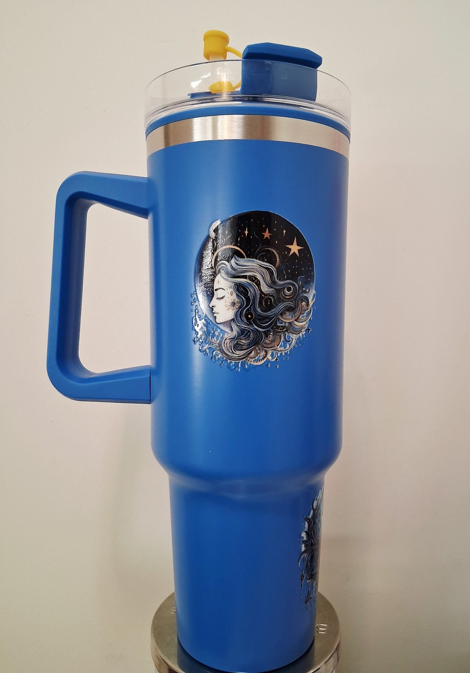 Blue 40 oz tumbler with side profiles of the Goddess Moon
