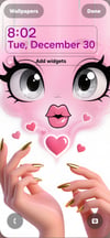 This artwork features expressive, wide-set eyes, glossy pink lips, elegant hands with gold nails, and floating heart sparkles — all brought to life with gentle animated motion.
