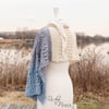 It’s an asymmetrical triangle shawl - With a Twist! The twisted rows add visual texture and interest, and provide the perfect counterpoint to the mindless flat rows. Color blocking adds a modern touch, though the shawl also looks amazing when worked in a single color. Customize the shawl to add twisted rows at any point or to adjust the size!