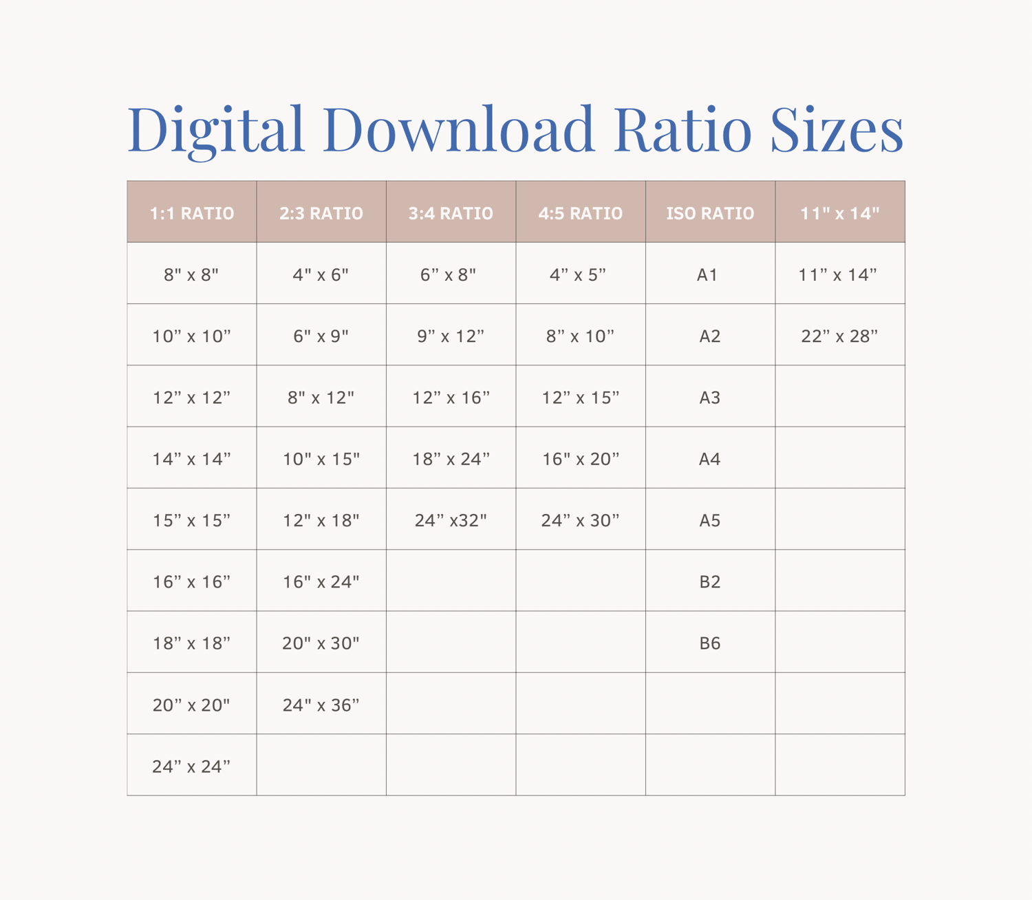 1:1 Ratio (8" x 8" | 10” x 10” | 12” x 12” | 14” x 14” | 15” x 15” | 16” x 16” | 18” x 18” | 20” x 20” | 24” x 24”)
