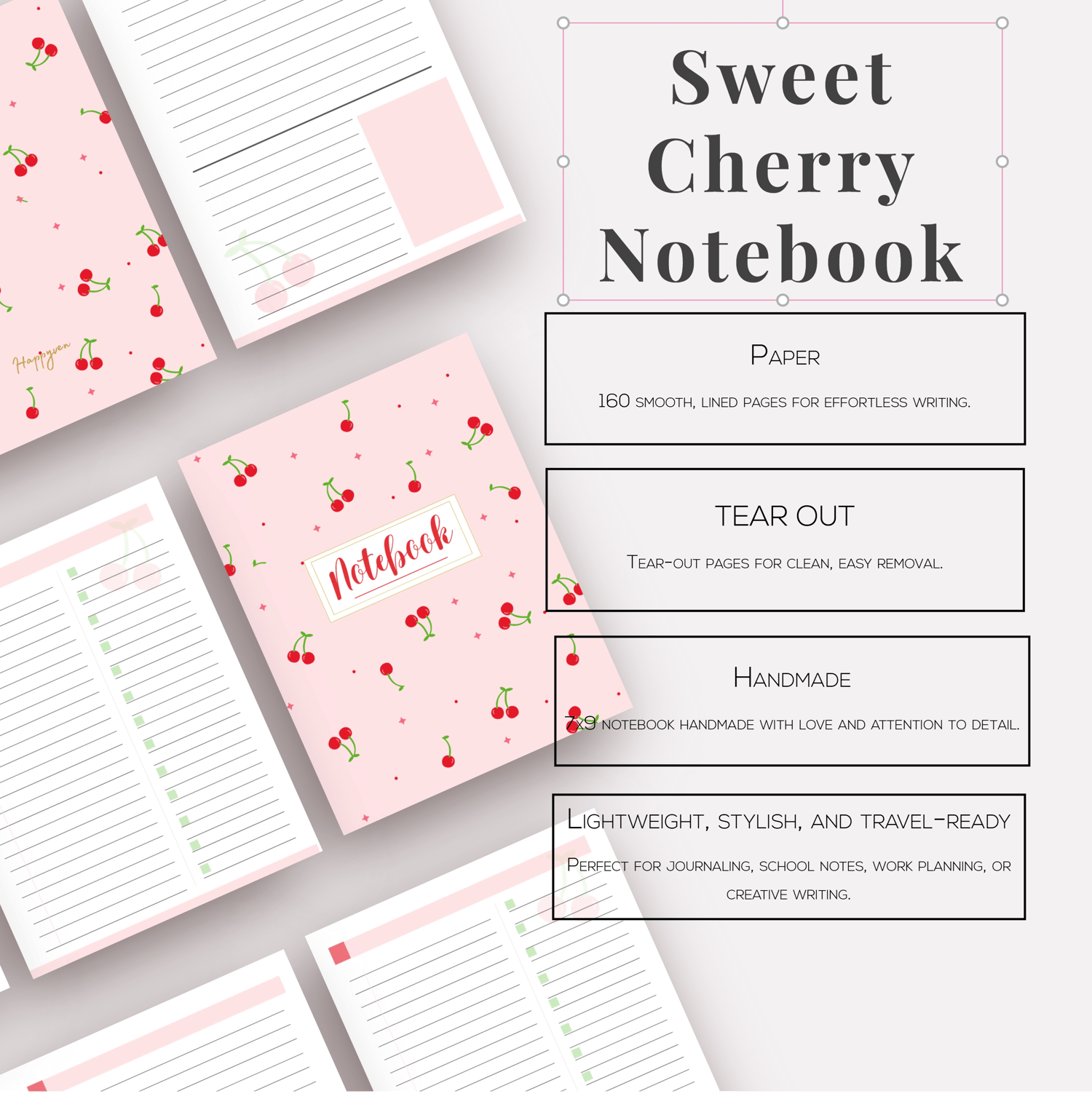 Turn everyday moments into something special with this stylish notebook. Whether you’re making lists, jotting down ideas, or simply indulging in a little creative freedom—Sweet Cherry Notebook makes it all feel more fun!
