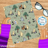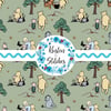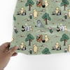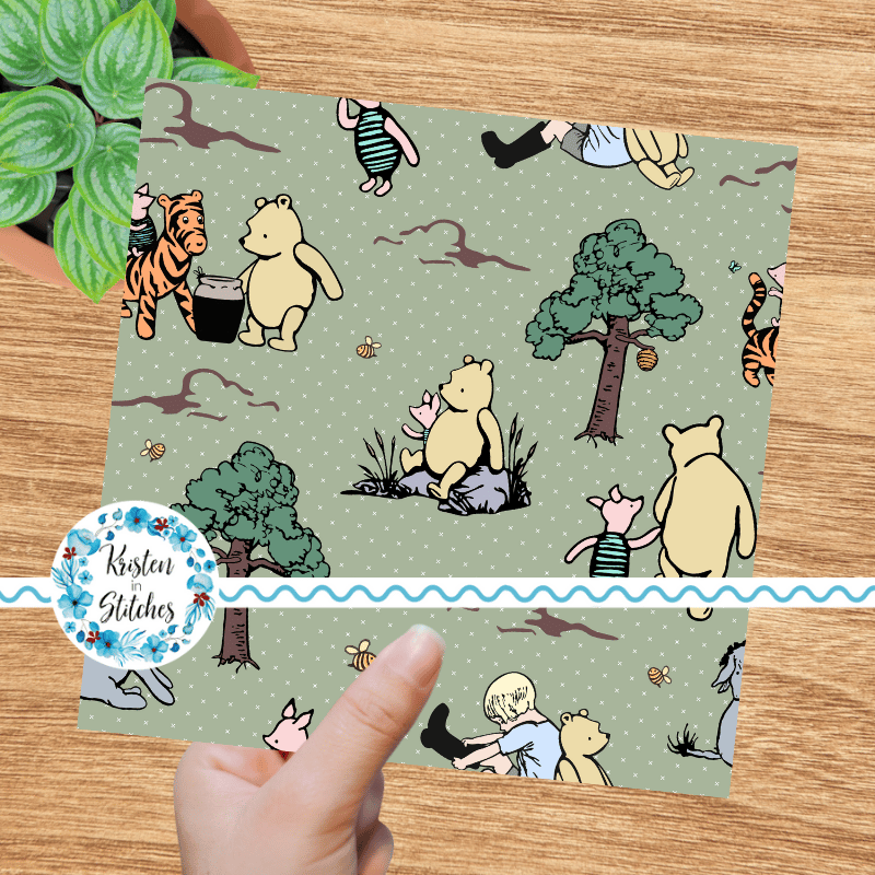 Classic Pooh storybook sketches from the 100 Acre Wood, including Eeyore, Tigger and Piglet on soft sage green.