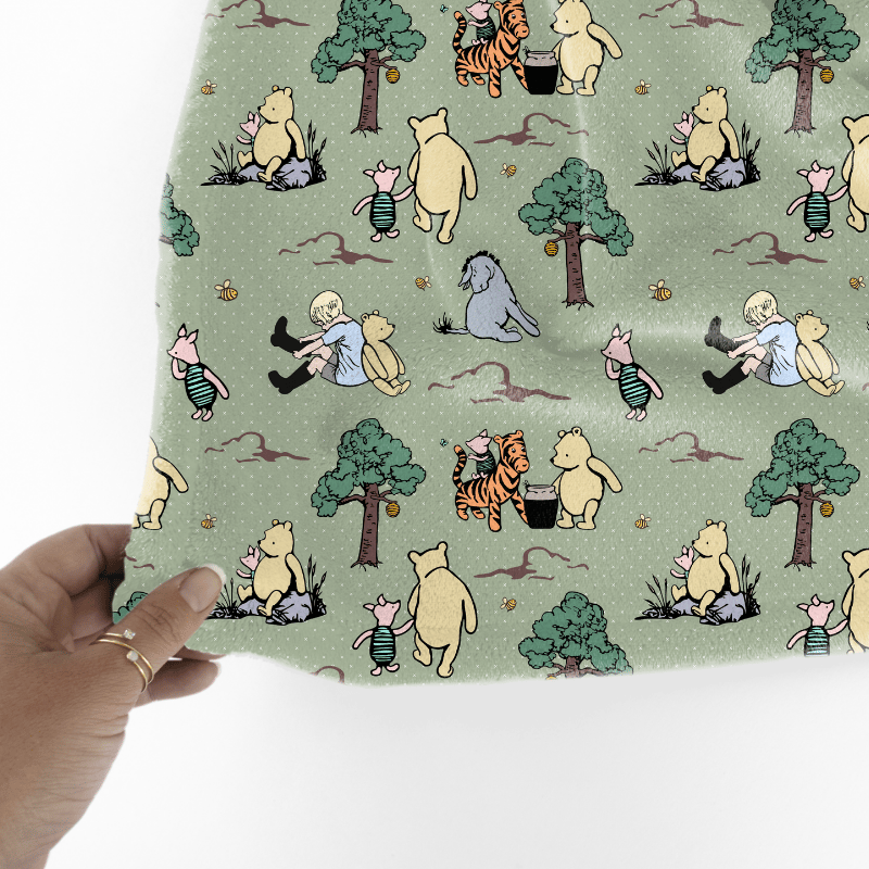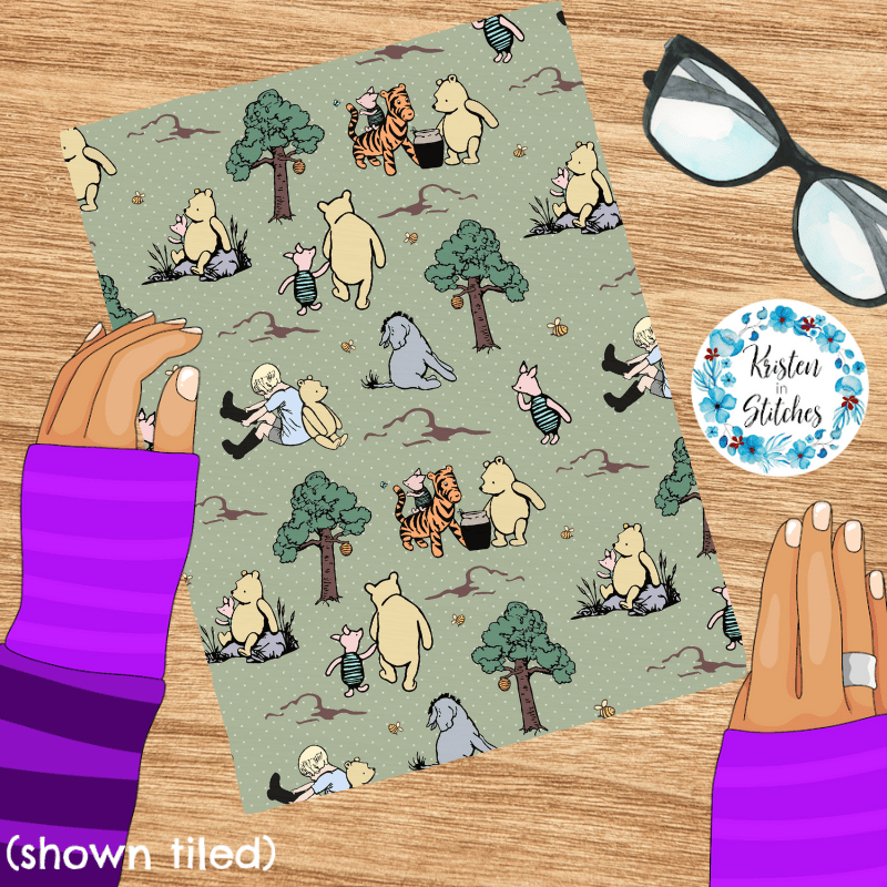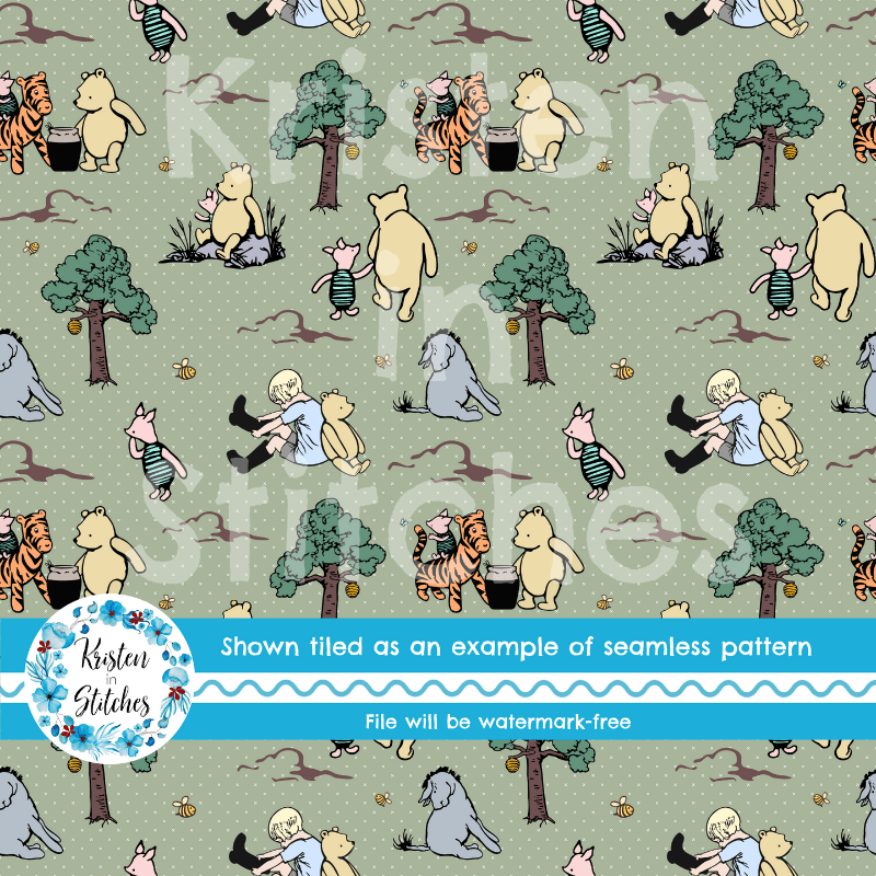 Classic Winnie the Pooh and Friends Storybook Sketches Nursery Seamless Pattern Soft Sage Green