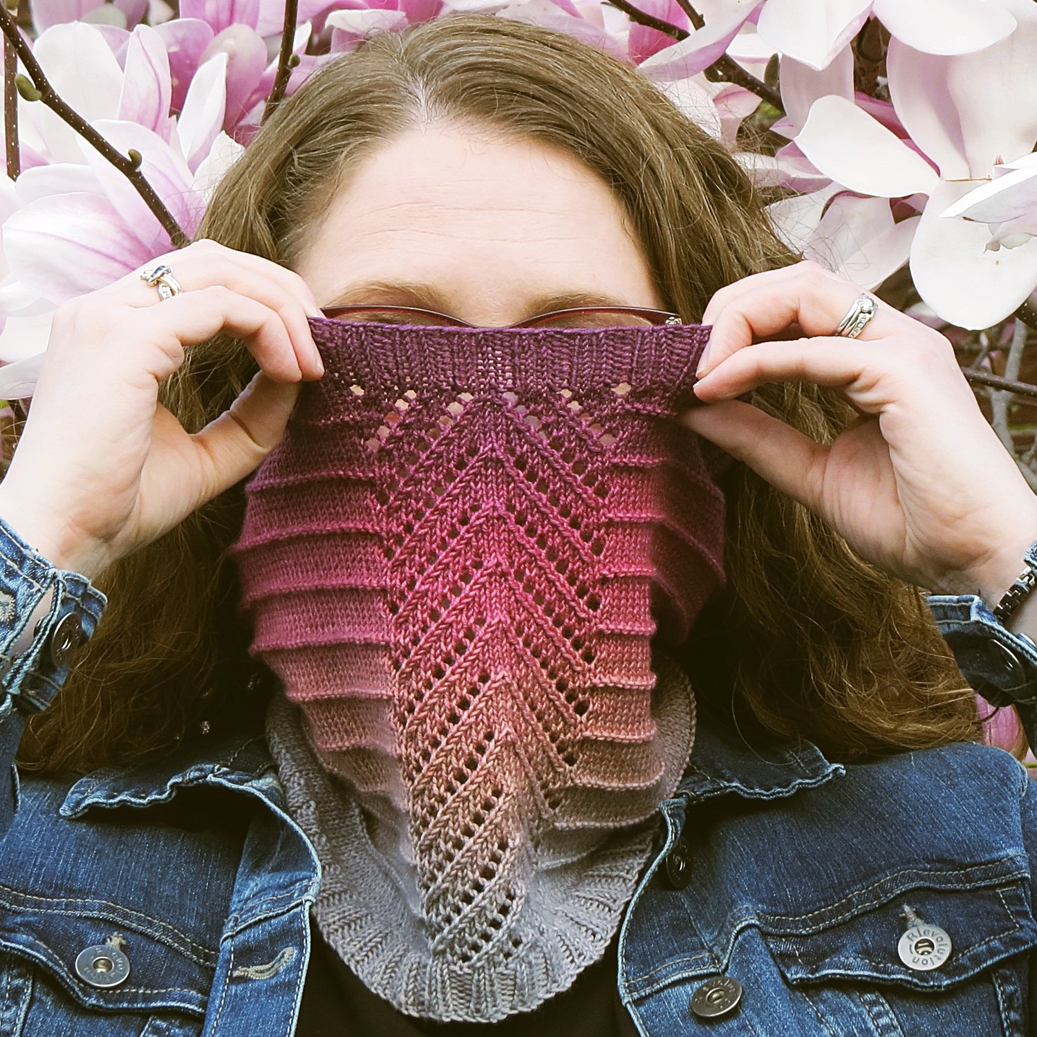 The Stripes and Peaks cowl is the fourth design in the Stripes and Peaks family. The cowl was designed to get maximum usage of a 300 yd (274m) gradient from The Blue Brick Dyeworks (Ladybug size). My sample is knit in the Winter Magnolia colourway.