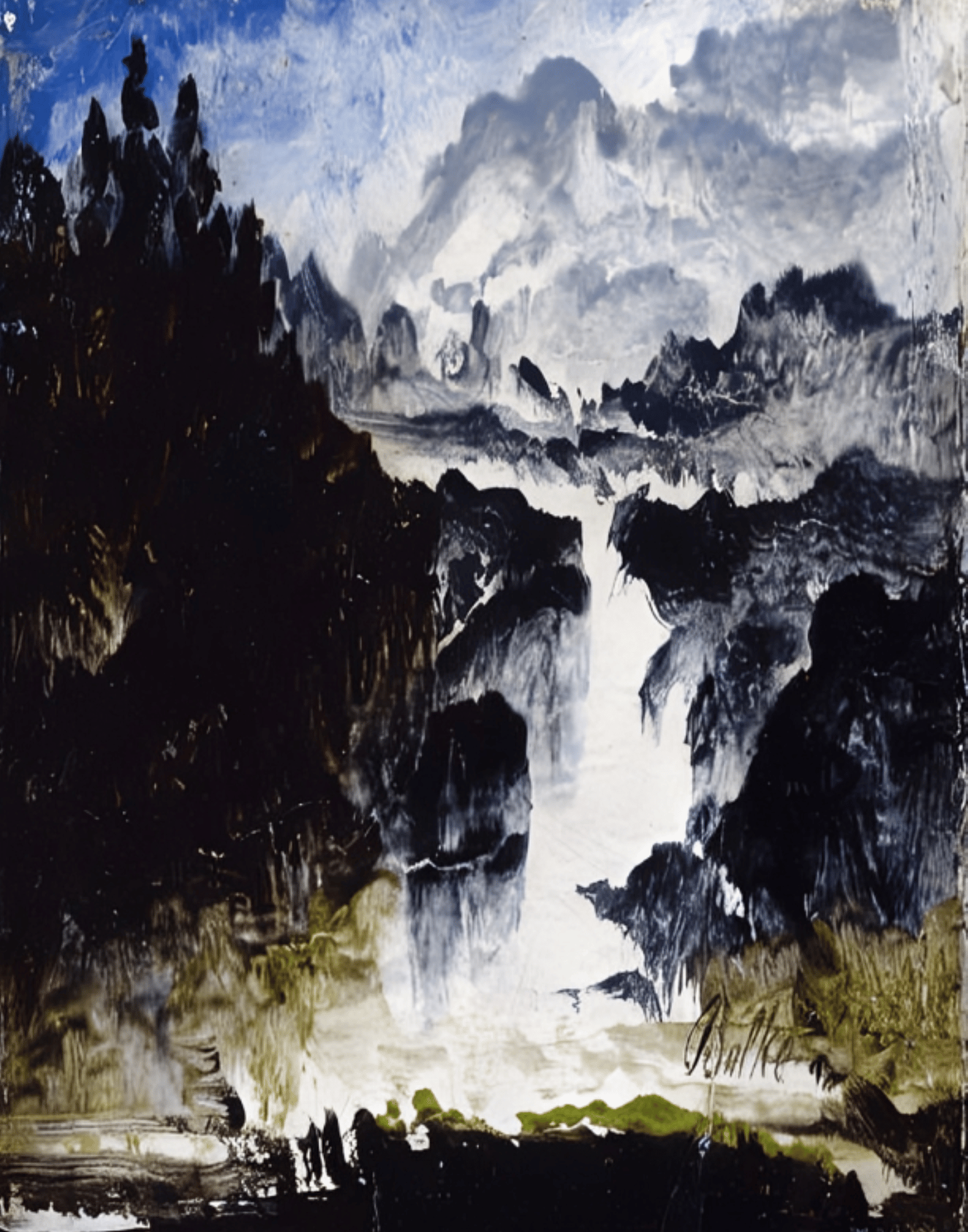 Mountain Natural Waterfall, Vintage Water Fall Landscape, Nostalgic Nature, Cool Nature, Rustic natural Landscape, Painting.