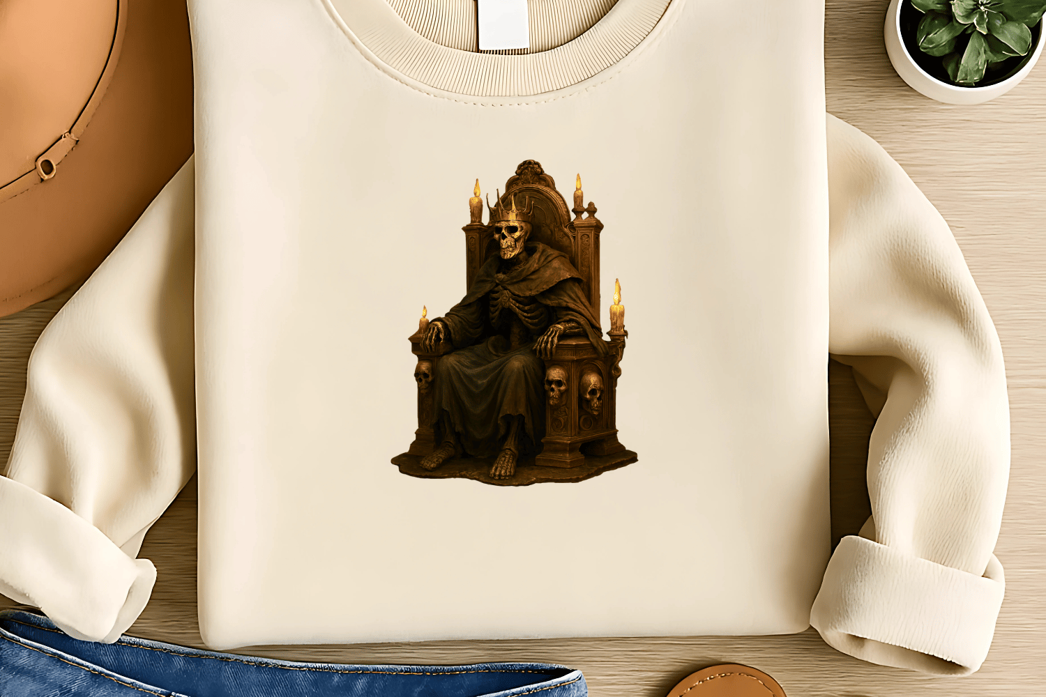 Golden Throne Skeleton Sublimation PNG – Majestic Undead King for T-Shirts – Spooky Regal Halloween – 300 DPI Instant Digital Download