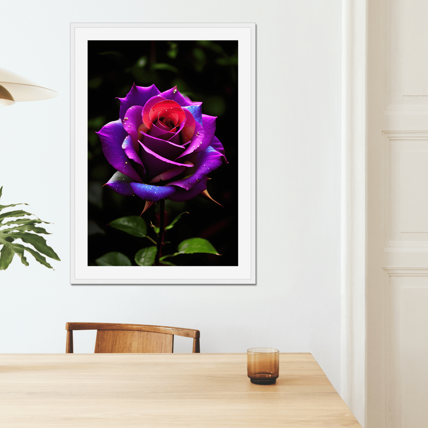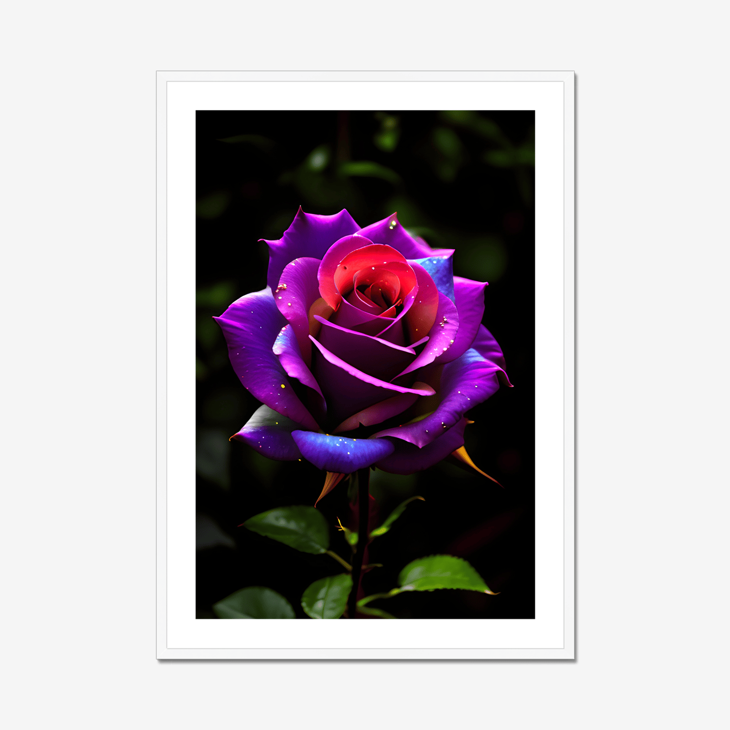 This stunning digital art print showcases the captivating beauty of a blue glittering rose against a striking black background. Perfect for adding a touch of elegance and mystique to any space, this unique piece is sure to captivate art enthusiasts and admirers alike.
