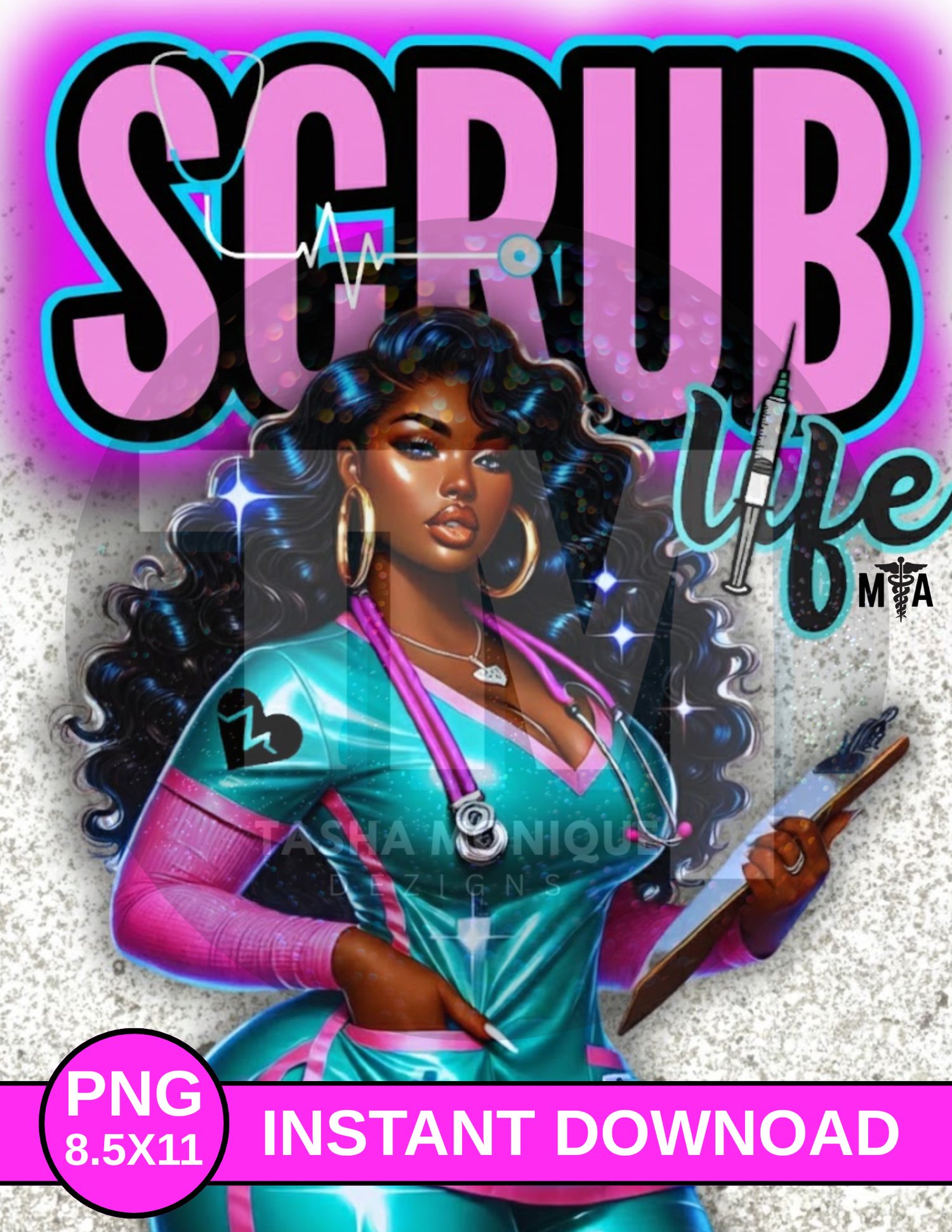 Celebrate the strength and style of nurses with this vibrant digital illustration. Featuring a confident African American nurse in bold scrubs, this design captures the essence of "Scrub Life." Perfect for adding a touch of inspiration to your space or creating unique gifts.