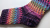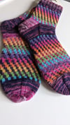 Knitted in the round these can be either knitted on double pointed needles using knit and purl stitches with decreases, colour changing yarn and a Kitchener stitch to finish the toe.