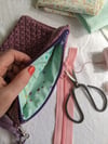 The finished Ziplet is 7.75 x 5.5 inches / 19.5 / 13.75 cm. The strap is 13" around.