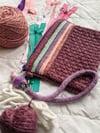 This pattern is perfect for stashbusting or using up minis. Note that the sides are worked using fingering held double, and the welts and strap are worked with fingering held singly.