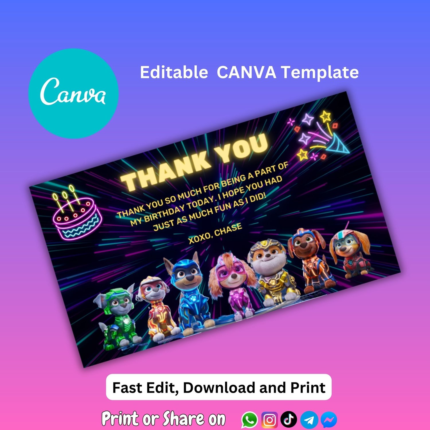 With our digital download, you can conveniently print as many copies as you need, making it ideal for parties of any size. Whether you're hosting a small gathering or a large extravaganza, our Neon Paw Patrol The mighty Movie 2023 Birthday Invitation delivers the perfect touch of whimsy and charm, setting the stage for an incredible celebration.