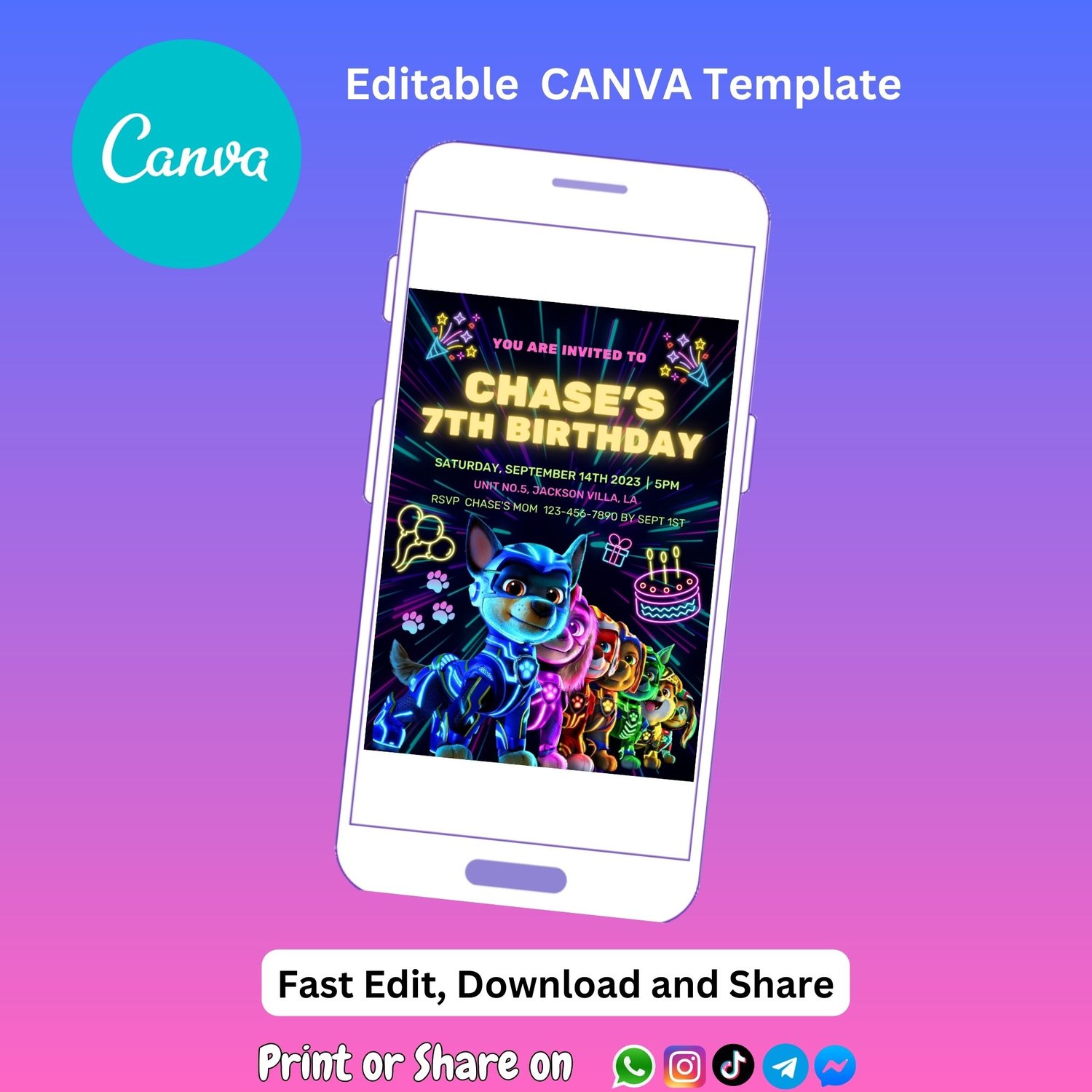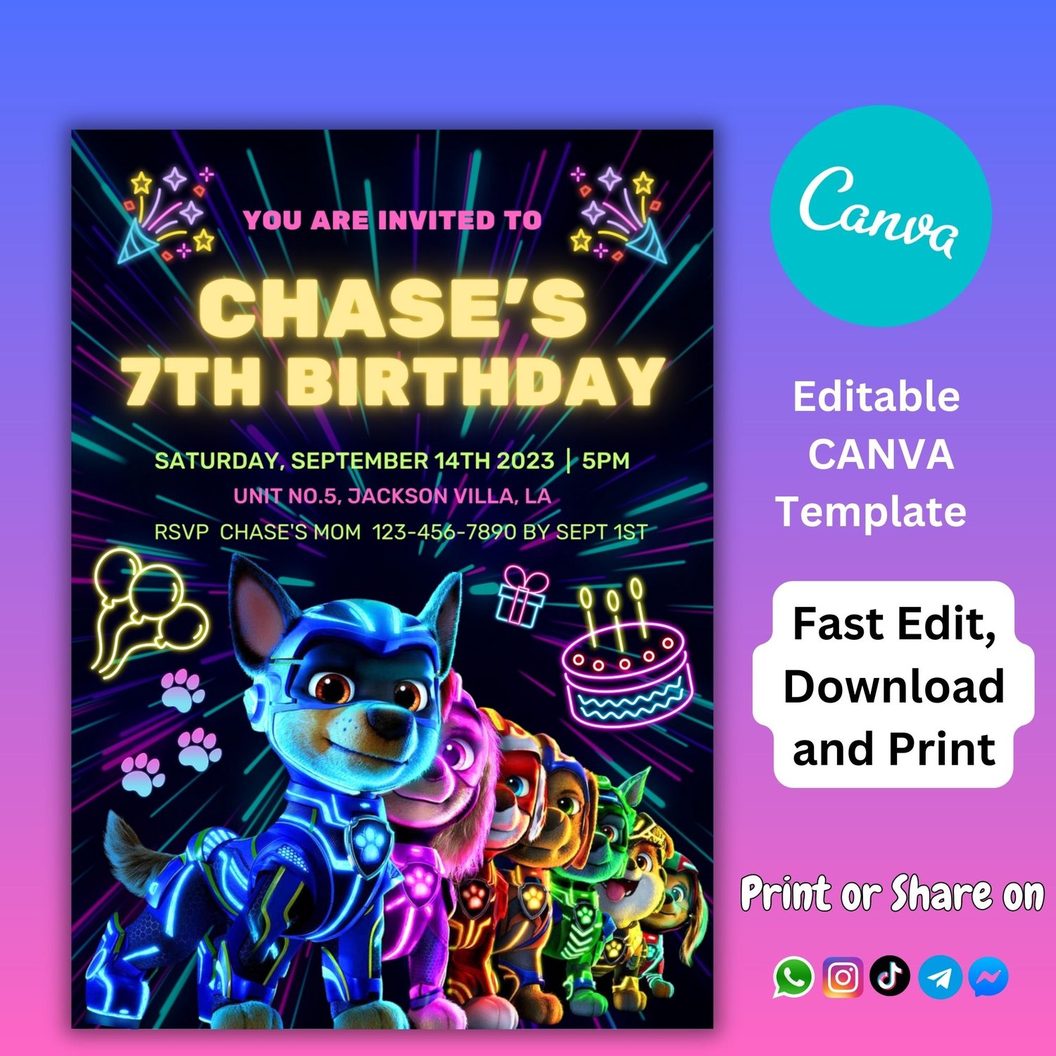 Paw Patrol Neon Birthday Invitation Template (Printable)